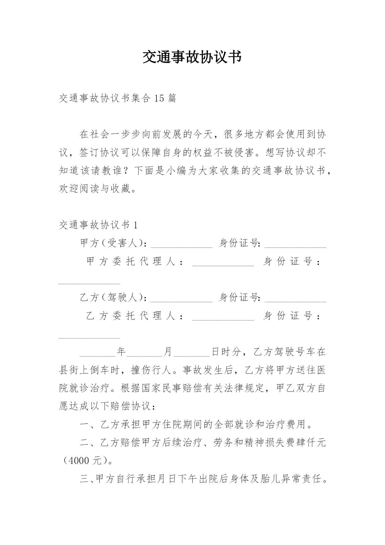 交通事故协议书交通事故协议书集合15篇在社会一步步向前发展的今天,很多地方都会使用到协议,签订协议可以保障自身的权益不被侵害。想写协议却不知道该请教谁?下面是小编为大家收集的交通事故协议书,欢迎阅读与收藏。交通事故协议书1甲方(受害人):____________身份证号:____________甲方委托代理人:____________身份证号:____________乙方(驾驶人):____________身份证号:____________乙方委托代理人:____________身份证号:________