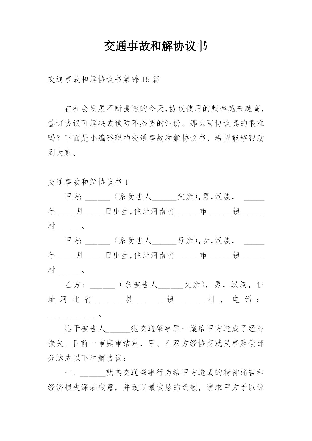 交通事故和解协议书交通事故和解协议书集锦15篇在社会发展不断提速的今天,协议使用的频率越来越高,签订协议可解决或预防不必要的纠纷。那么写协议真的很难吗?下面是小编整理的交通事故和解协议书,希望能够帮助到大家。交通事故和解协议书1甲方:______(系受害人______父亲),男,汉族,_____年_____月_____日出生,住址河南省______市______镇______村______。甲方:______(系受害人______母亲),女,汉族,_____年_____月_____日出生,住址河南省___