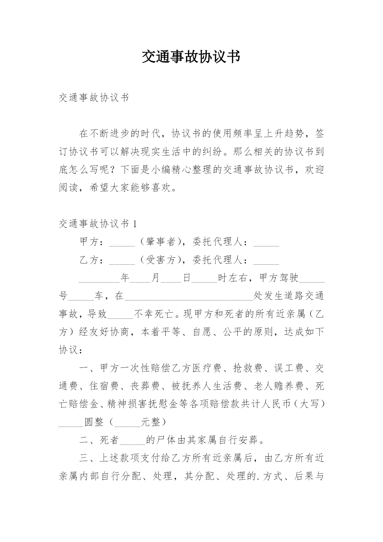 交通事故协议书交通事故协议书在不断进步的时代,协议书的使用频率呈上升趋势,签订协议书可以解决现实生活中的纠纷。那么相关的协议书到底怎么写呢?下面是小编精心整理的交通事故协议书,欢迎阅读,希望大家能够喜欢。交通事故协议书1甲方:_____(肇事者),委托代理人:_____乙方:_____(受害方),委托代理人:_____________年____月____日_____时左右,甲方驾驶_____号_____车,在_________________________处发生道路交通事故,导致_____不幸死亡。现甲