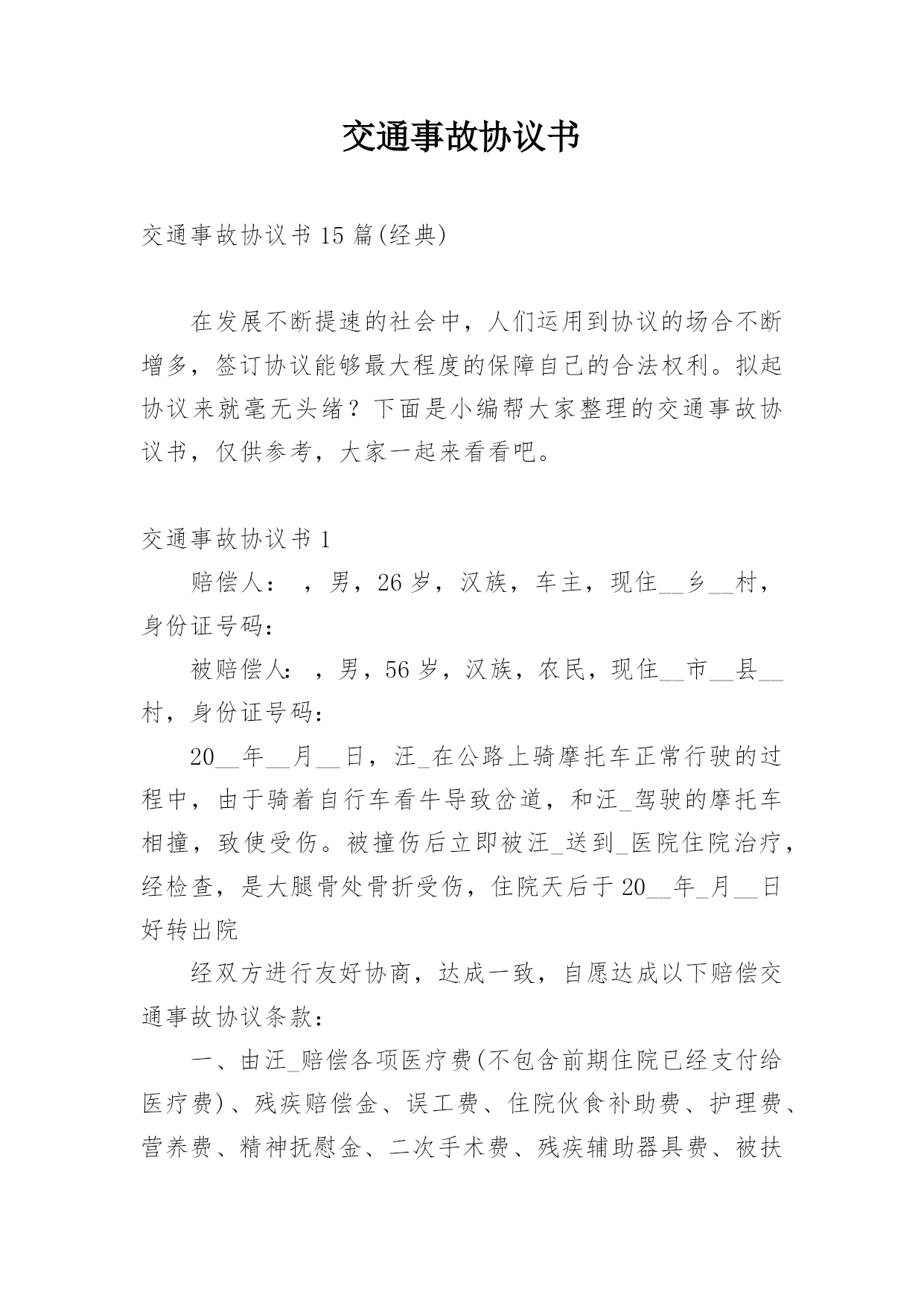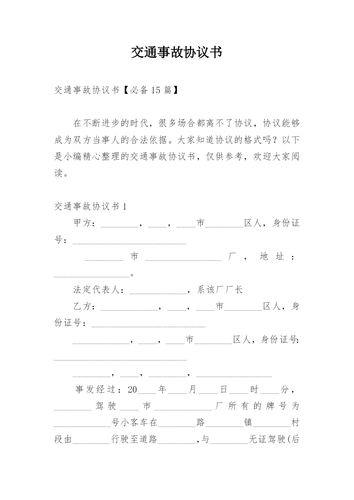 交通事故协议书交通事故协议书【必备15篇】在不断进步的时代,很多场合都离不了协议,协议能够成为双方当事人的合法依据。大家知道协议的格式吗?以下是小编精心整理的交通事故协议书,仅供参考,欢迎大家阅读。交通事故协议书1甲方:________,____,____市________区人,身份证号:________________________________市________________厂,地址:________________。法定代表人:____________,系该厂厂长乙方:____________