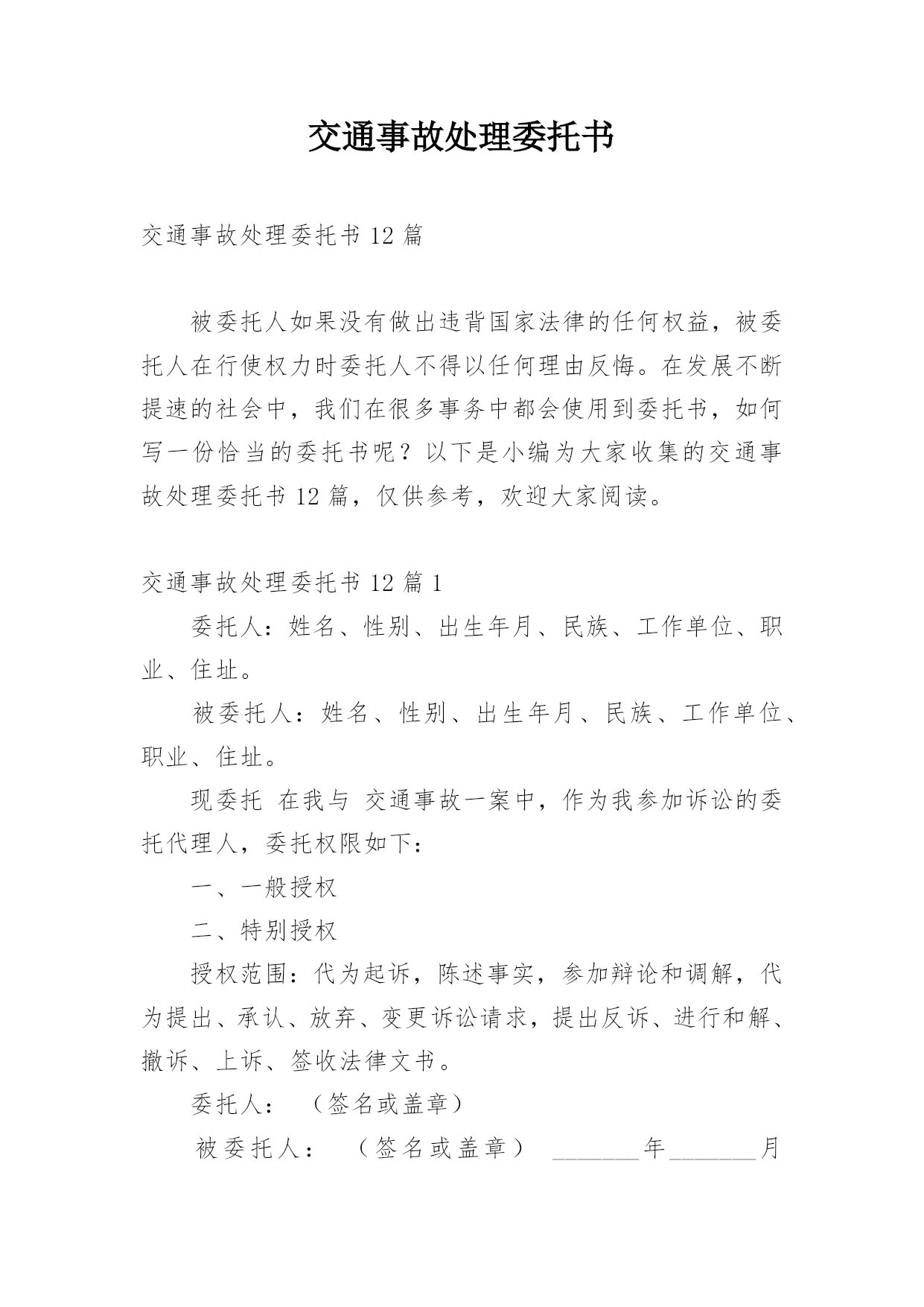 交通事故处理委托书交通事故处理委托书12篇被委托人如果没有做出违背国家法律的任何权益,被委托人在行使权力时委托人不得以任何理由反悔。在发展不断提速的社会中,我们在很多事务中都会使用到委托书,如何写一份恰当的委托书呢?以下是小编为大家收集的交通事故处理委托书12篇,仅供参考,欢迎大家阅读。交通事故处理委托书12篇1委托人:姓名、性别、出生年月、民族、工作单位、职业、住址。被委托人:姓名、性别、出生年月、民族、工作单位、职业、住址。现委托在我与交通事故一案中,作为我参加诉讼的委托代理人,委托权限如下:一、一般