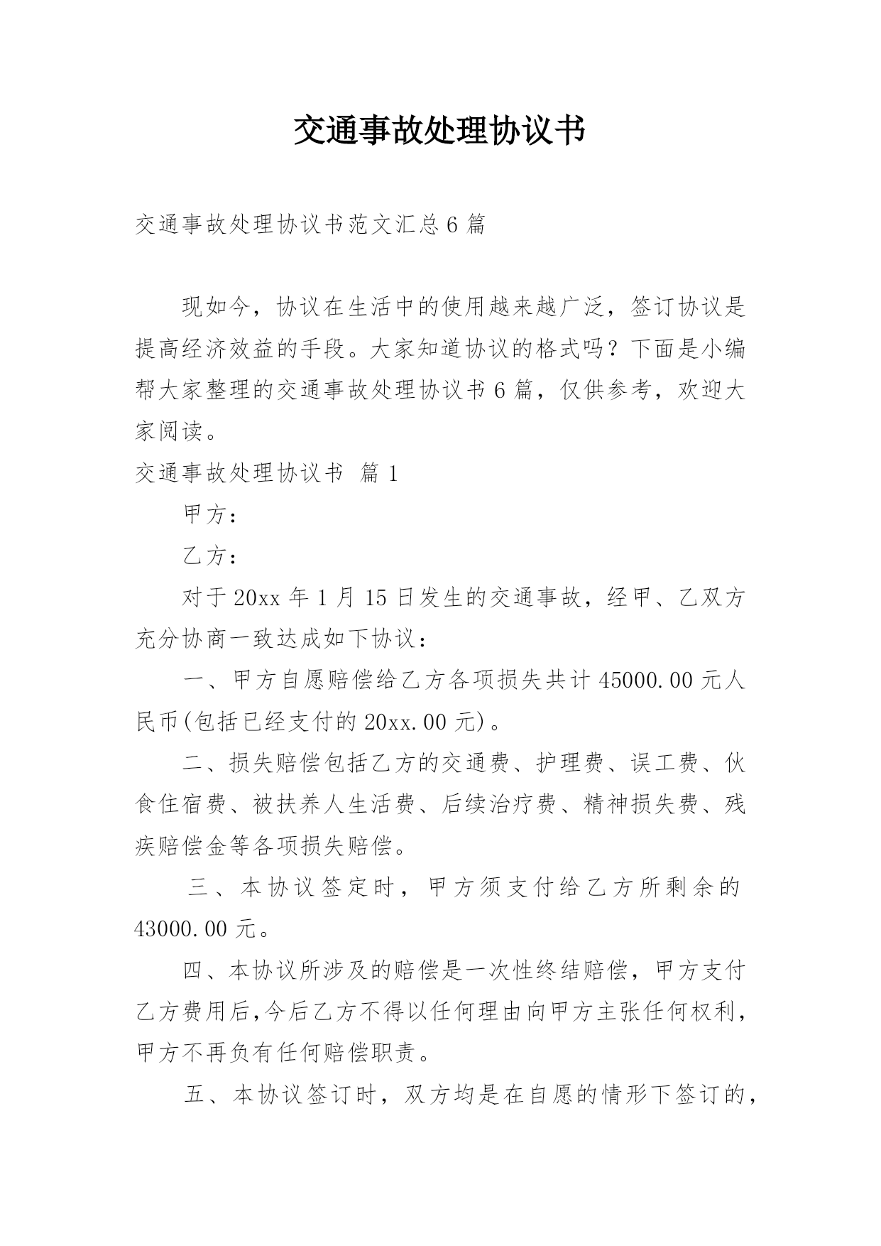 交通事故处理协议书交通事故处理协议书范文汇总6篇现如今,协议在生活中的使用越来越广泛,签订协议是提高经济效益的手段。大家知道协议的格式吗?下面是小编帮大家整理的交通事故处理协议书6篇,仅供参考,欢迎大家阅读。交通事故处理协议书篇1甲方:乙方:对于20xx年1月15日发生的交通事故,经甲、乙双方充分协商一致达成如下协议:一、甲方自愿赔偿给乙方各项损失共计45000.00元人民币(包括已经支付的20xx.00元)。二、损失赔偿包括乙方的交通费、护理费、误工费、伙食住宿费、被扶养人生活费、后续治疗费、精神损失费