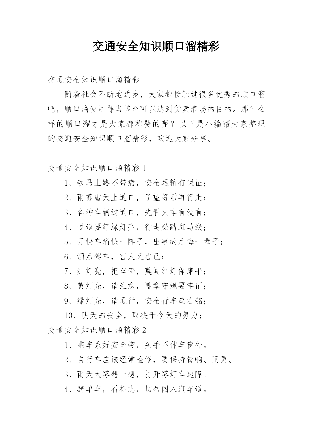 交通安全知识顺口溜精彩交通安全知识顺口溜精彩随着社会不断地进步,大家都接触过很多优秀的顺口溜吧,顺口溜使用得当甚至可以达到货卖清场的目的。那什么样的顺口溜才是大家都称赞的呢?以下是小编帮大家整理的交通安全知识顺口溜精彩,欢迎大家分享。交通安全知识顺口溜精彩11、铁马上路不带病,安全运输有保证;2、雨雾雪天上道口,了望好后再行走;3、各种车辆过道口,先看火车有没有;4、过道要等绿灯亮,行走必踏斑马线;5、开快车痛快一阵子,出事故后悔一辈子;6、酒后驾车,害人又害己;7、红灯亮,把车停,莫闯红灯保康平;8、黄