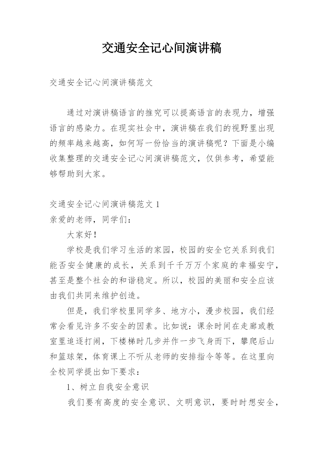 交通安全记心间演讲稿交通安全记心间演讲稿范文通过对演讲稿语言的推究可以提高语言的表现力,增强语言的感染力。在现实社会中,演讲稿在我们的视野里出现的频率越来越高,如何写一份恰当的演讲稿呢?下面是小编收集整理的交通安全记心间演讲稿范文,仅供参考,希望能够帮助到大家。交通安全记心间演讲稿范文1亲爱的老师,同学们:大家好!学校是我们学习生活的家园,校园的安全它关系到我们能否安全健康的成长,关系到千千万万个家庭的幸福安宁,甚至是整个社会的和谐稳定。所以,校园的美丽和安全应该由我们共同来维护创造。但是,我们学校里同学