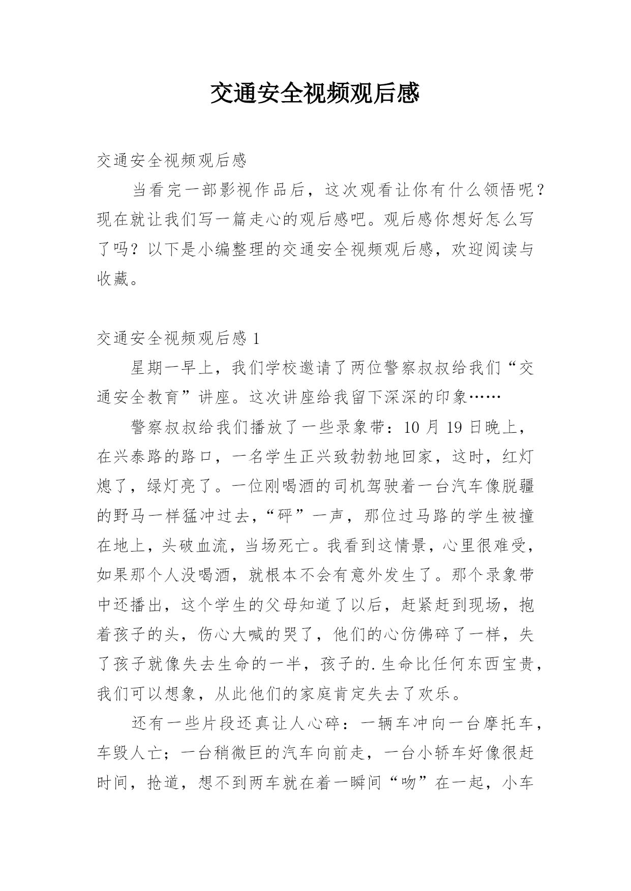 交通安全视频观后感交通安全视频观后感当看完一部影视作品后,这次观看让你有什么领悟呢?现在就让我们写一篇走心的观后感吧。观后感你想好怎么写了吗?以下是小编整理的交通安全视频观后感,欢迎阅读与收藏。交通安全视频观后感1星期一早上,我们学校邀请了两位警察叔叔给我们“交通安全教育”讲座。这次讲座给我留下深深的印象……警察叔叔给我们播放了一些录象带:10月19日晚上,在兴泰路的路口,一名学生正兴致勃勃地回家,这时,红灯熄了,绿灯亮了。一位刚喝酒的司机驾驶着一台汽车像脱疆的野马一样猛冲过去,“砰”一声,那位过马路的学