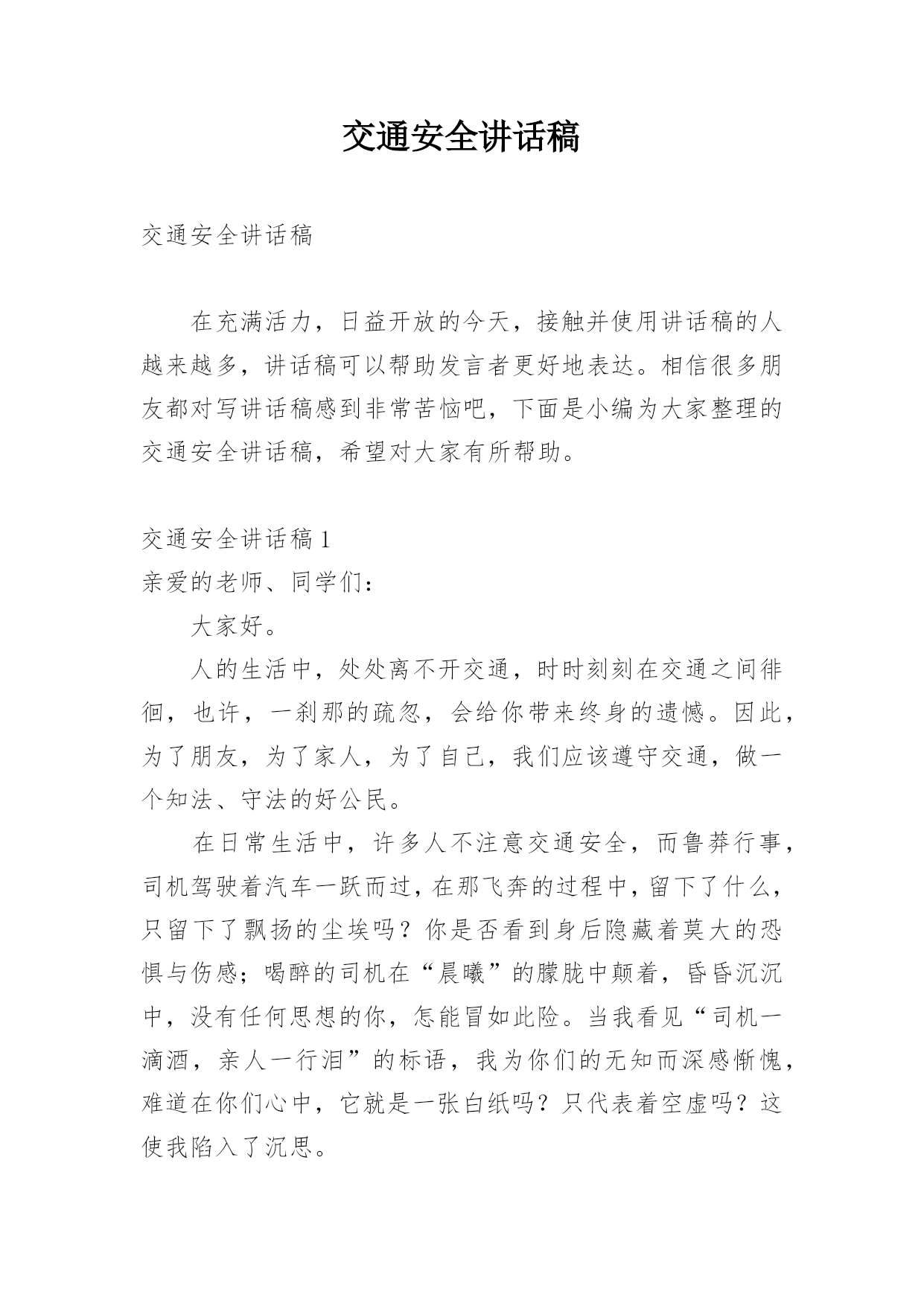 交通安全讲话稿交通安全讲话稿在充满活力,日益开放的今天,接触并使用讲话稿的人越来越多,讲话稿可以帮助发言者更好地表达。相信很多朋友都对写讲话稿感到非常苦恼吧,下面是小编为大家整理的交通安全讲话稿,希望对大家有所帮助。交通安全讲话稿1亲爱的老师、同学们:大家好。人的生活中,处处离不开交通,时时刻刻在交通之间徘徊,也许,一刹那的疏忽,会给你带来终身的遗憾。因此,为了朋友,为了家人,为了自己,我们应该遵守交通,做一个知法、守法的好公民。在日常生活中,许多人不注意交通安全,而鲁莽行事,司机驾驶着汽车一跃而过,在那