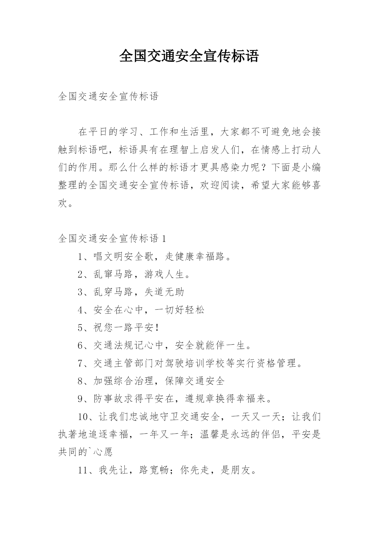 全国交通安全宣传标语全国交通安全宣传标语在平日的学习、工作和生活里,大家都不可避免地会接触到标语吧,标语具有在理智上启发人们,在情感上打动人们的作用。那么什么样的标语才更具感染力呢?下面是小编整理的全国交通安全宣传标语,欢迎阅读,希望大家能够喜欢。全国交通安全宣传标语11、唱文明安全歌,走健康幸福路。2、乱窜马路,游戏人生。3、乱穿马路,失道无助4、安全在心中,一切好轻松5、祝您一路平安!6、交通法规记心中,安全就能伴一生。7、交通主管部门对驾驶培训学校等实行资格管理。8、加强综合治理,保障交通安全9、防