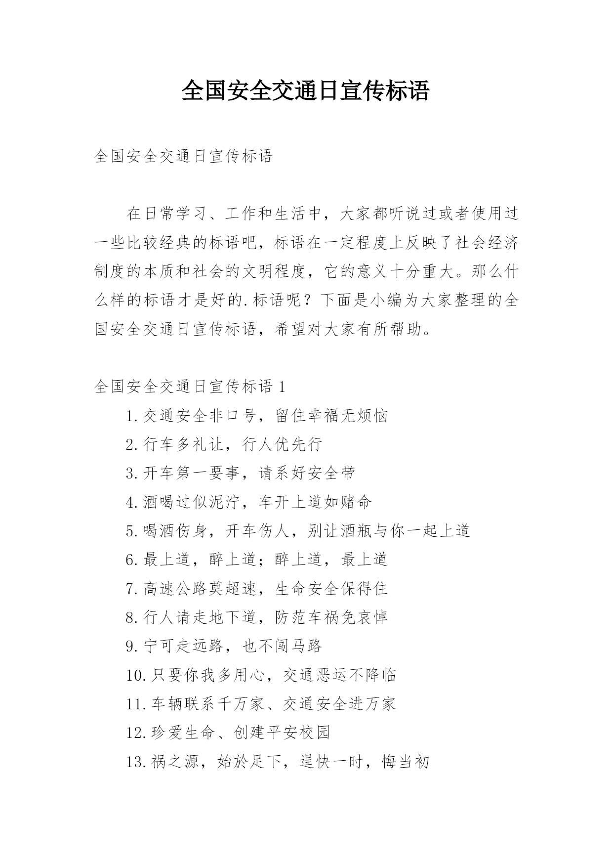 全国安全交通日宣传标语全国安全交通日宣传标语在日常学习、工作和生活中,大家都听说过或者使用过一些比较经典的标语吧,标语在一定程度上反映了社会经济制度的本质和社会的文明程度,它的意义十分重大。那么什么样的标语才是好的.标语呢?下面是小编为大家整理的全国安全交通日宣传标语,希望对大家有所帮助。全国安全交通日宣传标语11.交通安全非口号,留住幸福无烦恼2.行车多礼让,行人优先行3.开车第一要事,请系好安全带4.酒喝过似泥泞,车开上道如赌命5.喝酒伤身,开车伤人,别让酒瓶与你一起上道6.最上道,醉上道;醉上道,最