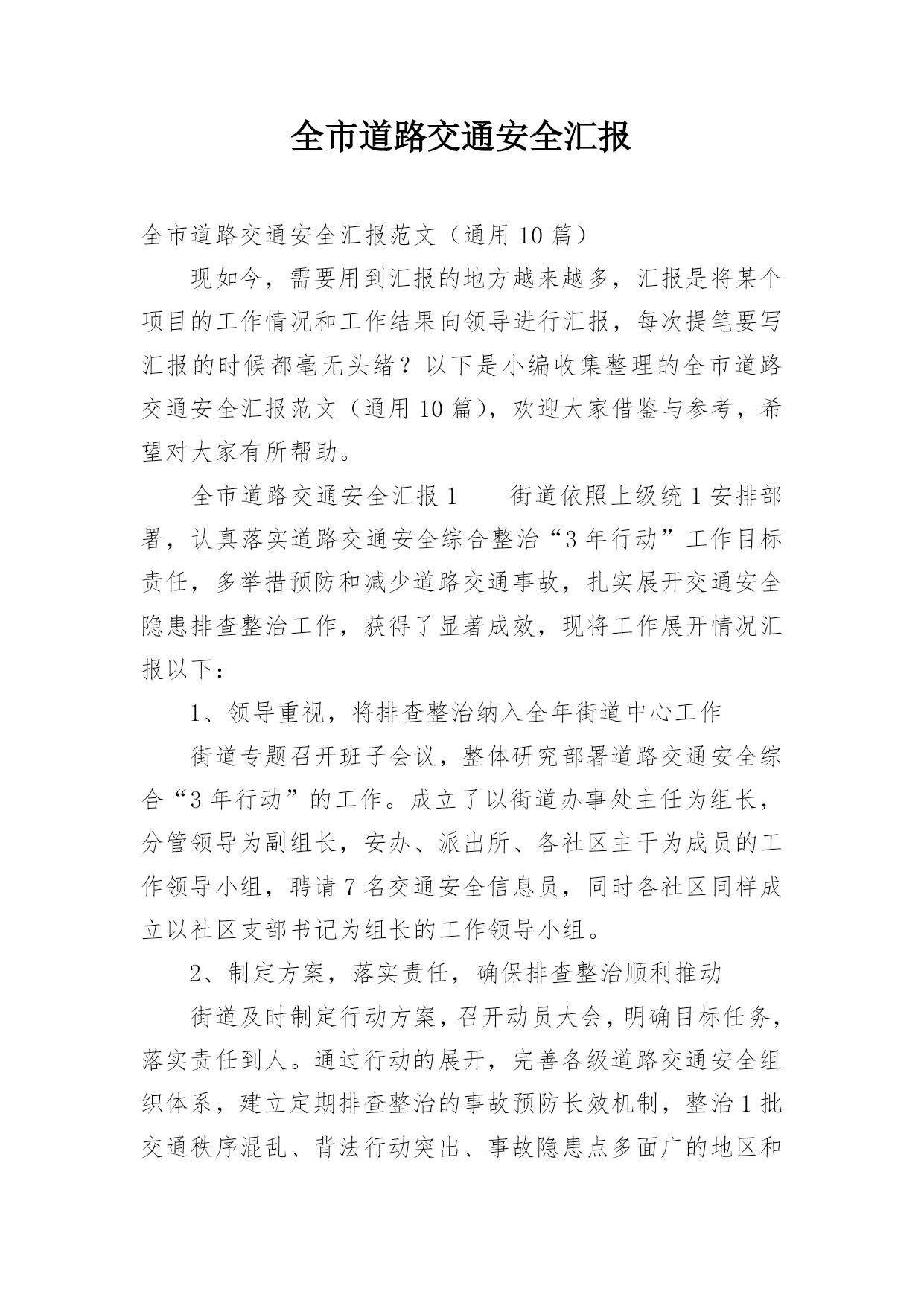 全市道路交通安全汇报全市道路交通安全汇报范文(通用10篇)现如今,需要用到汇报的地方越来越多,汇报是将某个项目的工作情况和工作结果向领导进行汇报,每次提笔要写汇报的时候都毫无头绪?以下是小编收集整理的全市道路交通安全汇报范文(通用10篇),欢迎大家借鉴与参考,希望对大家有所帮助。全市道路交通安全汇报1街道依照上级统1安排部署,认真落实道路交通安全综合整治“3年行动”工作目标责任,多举措预防和减少道路交通事故,扎实展开交通安全隐患排查整治工作,获得了显著成效,现将工作展开情况汇报以下:1、领导重视,将排查整