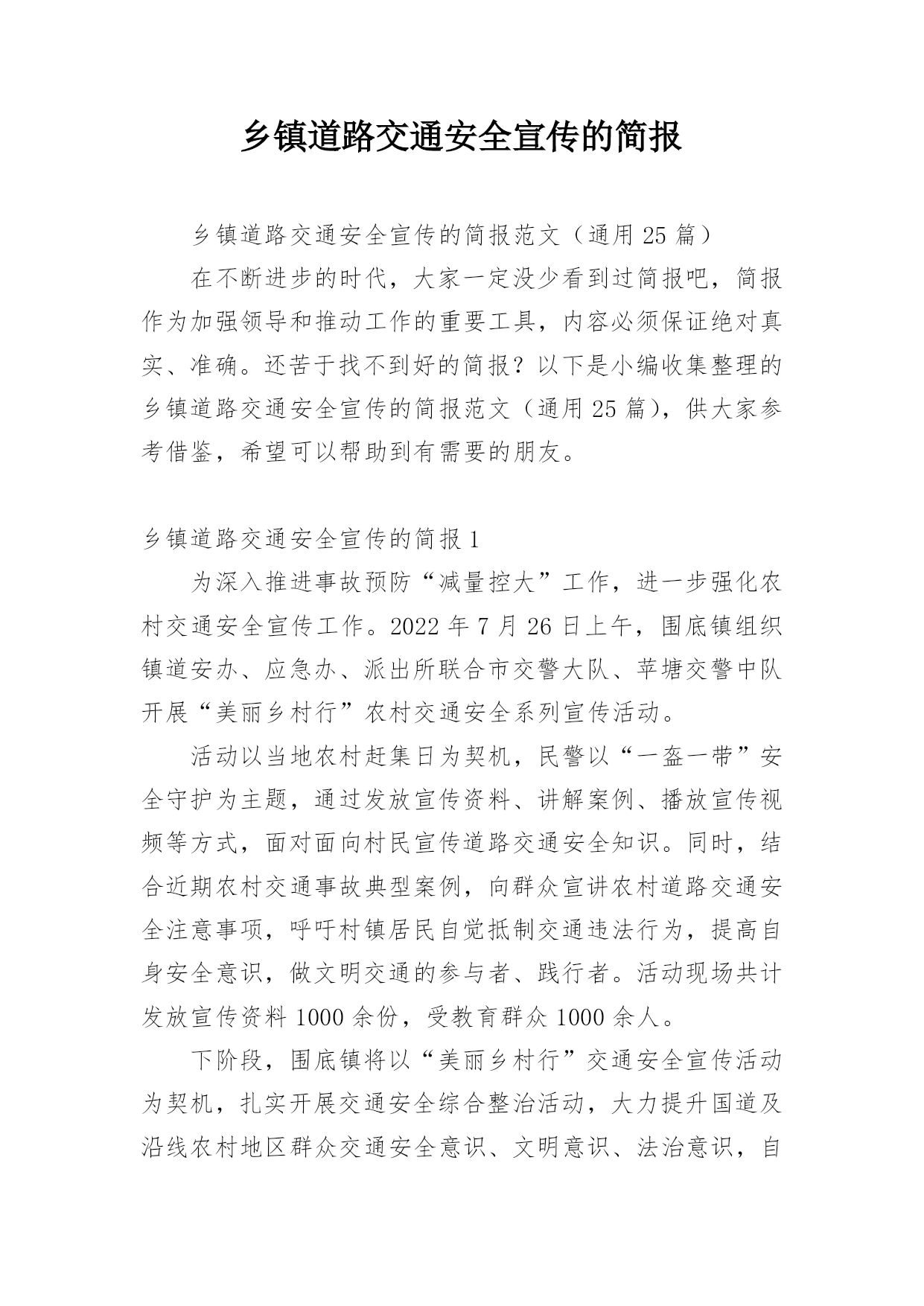 乡镇道路交通安全宣传的简报乡镇道路交通安全宣传的简报范文(通用25篇)在不断进步的时代,大家一定没少看到过简报吧,简报作为加强领导和推动工作的重要工具,内容必须保证绝对真实、准确。还苦于找不到好的简报?以下是小编收集整理的乡镇道路交通安全宣传的简报范文(通用25篇),供大家参考借鉴,希望可以帮助到有需要的朋友。乡镇道路交通安全宣传的简报1为深入推进事故预防“减量控大”工作,进一步强化农村交通安全宣传工作。2022年7月26日上午,围底镇组织镇道安办、应急办、派出所联合市交警大队、苹塘交警中队开展“美丽乡村
