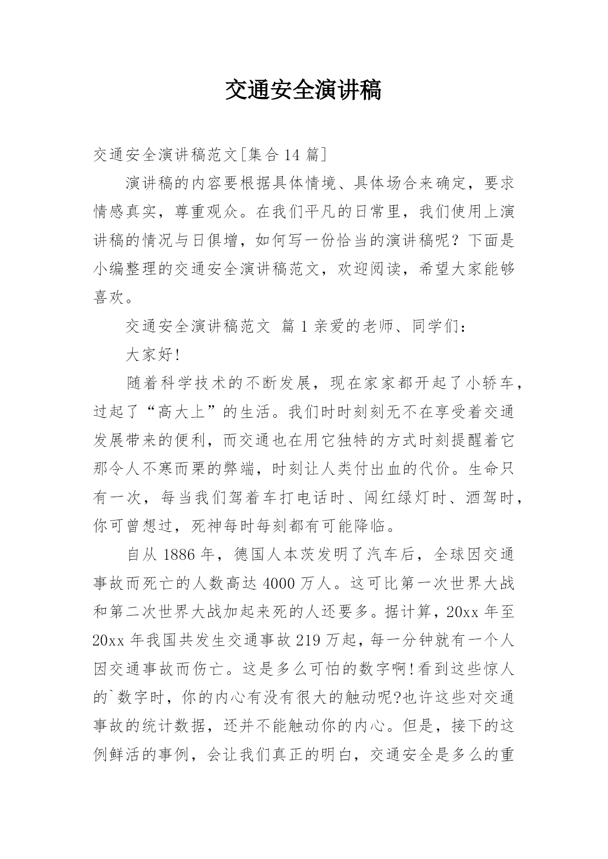 交通安全演讲稿交通安全演讲稿范文[集合14篇]演讲稿的内容要根据具体情境、具体场合来确定,要求情感真实,尊重观众。在我们平凡的日常里,我们使用上演讲稿的情况与日俱增,如何写一份恰当的演讲稿呢?下面是小编整理的交通安全演讲稿范文,欢迎阅读,希望大家能够喜欢。交通安全演讲稿范文篇1亲爱的老师、同学们:大家好!随着科学技术的不断发展,现在家家都开起了小轿车,过起了“高大上”的生活。我们时时刻刻无不在享受着交通发展带来的便利,而交通也在用它独特的方式时刻提醒着它那令人不寒而栗的弊端,时刻让人类付出血的代价。生命只
