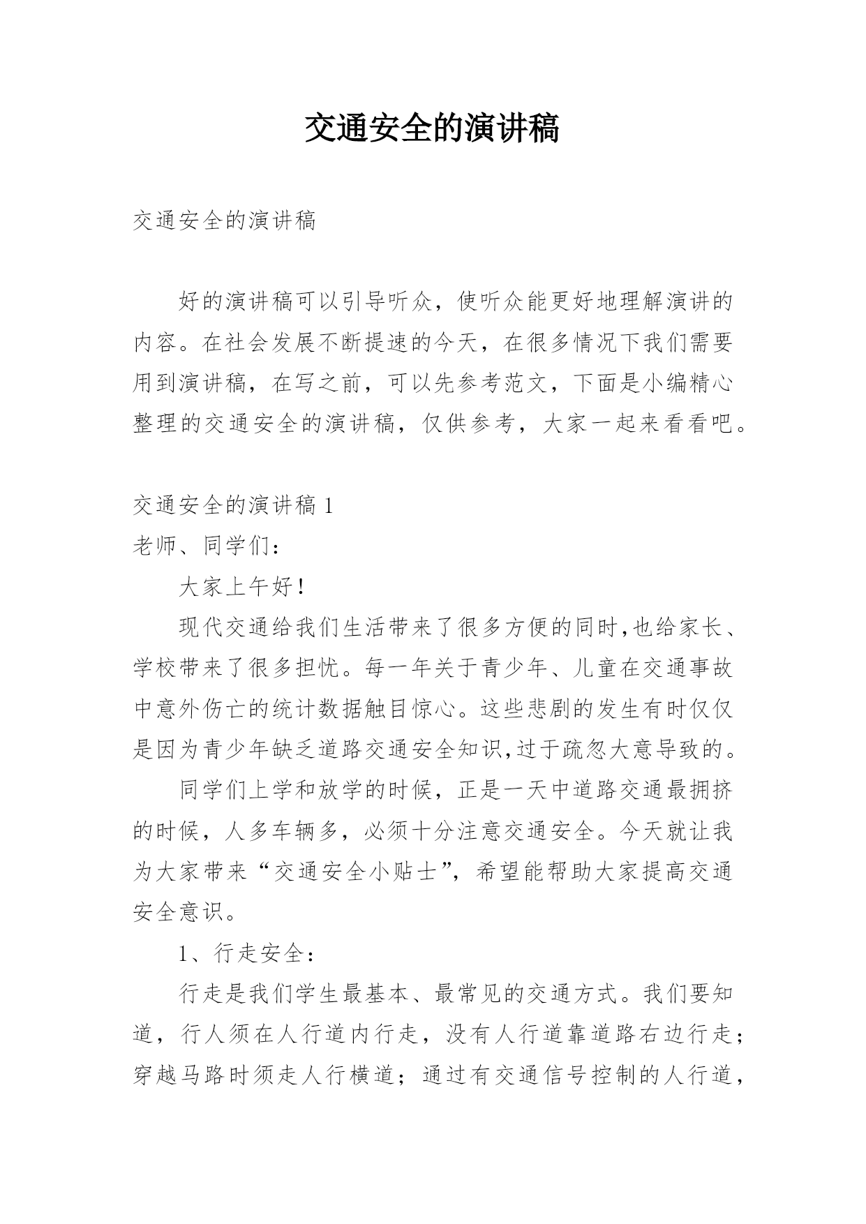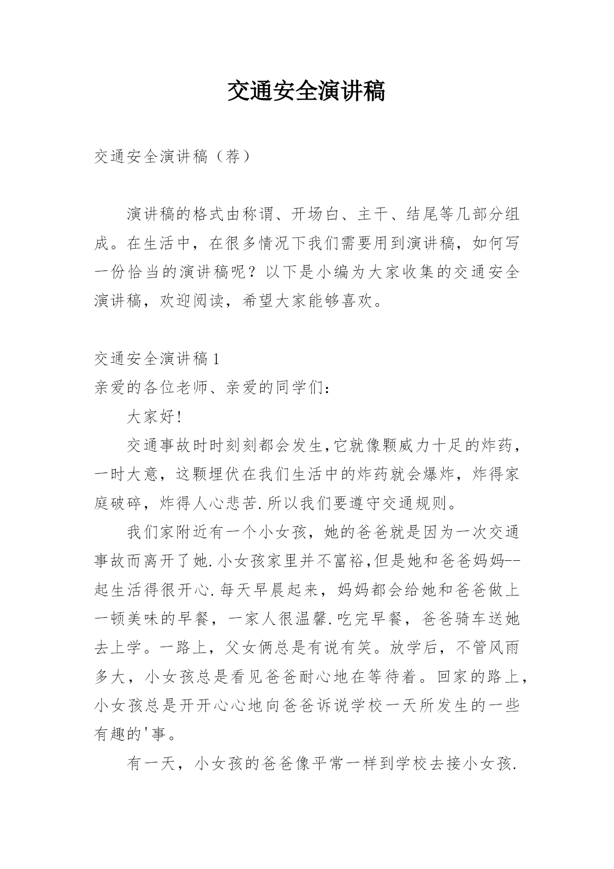 交通安全演讲稿交通安全演讲稿(荐)演讲稿的格式由称谓、开场白、主干、结尾等几部分组成。在生活中,在很多情况下我们需要用到演讲稿,如何写一份恰当的演讲稿呢?以下是小编为大家收集的交通安全演讲稿,欢迎阅读,希望大家能够喜欢。交通安全演讲稿1亲爱的各位老师、亲爱的同学们:大家好!交通事故时时刻刻都会发生,它就像颗威力十足的炸药,一时大意,这颗埋伏在我们生活中的炸药就会爆炸,炸得家庭破碎,炸得人心悲苦.所以我们要遵守交通规则。我们家附近有一个小女孩,她的爸爸就是因为一次交通事故而离开了她.小女孩家里并不富裕,但是