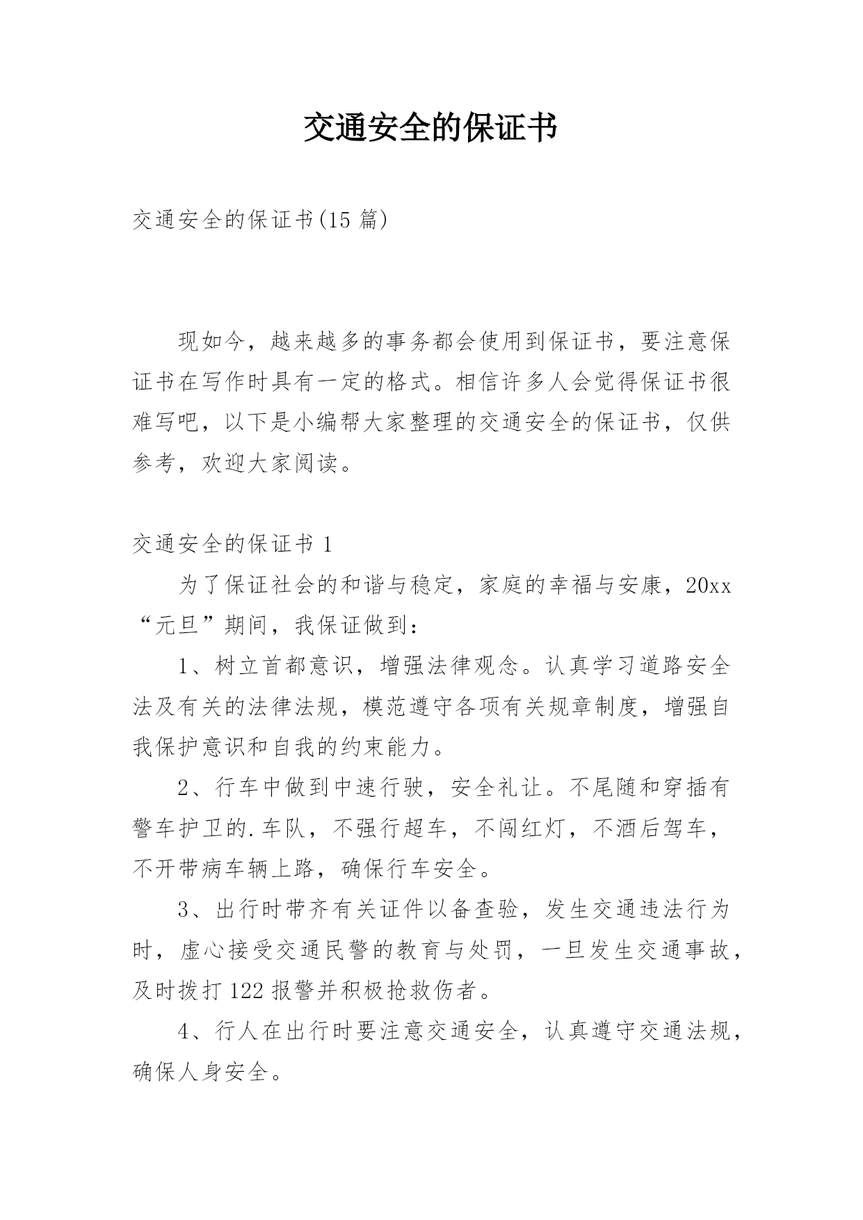 交通安全的保证书交通安全的保证书(15篇)现如今,越来越多的事务都会使用到保证书,要注意保证书在写作时具有一定的格式。相信许多人会觉得保证书很难写吧,以下是小编帮大家整理的交通安全的保证书,仅供参考,欢迎大家阅读。交通安全的保证书1为了保证社会的和谐与稳定,家庭的幸福与安康,20xx“元旦”期间,我保证做到:1、树立首都意识,增强法律观念。认真学习道路安全法及有关的法律法规,模范遵守各项有关规章制度,增强自我保护意识和自我的约束能力。2、行车中做到中速行驶,安全礼让。不尾随和穿插有警车护卫的.车队,不强行