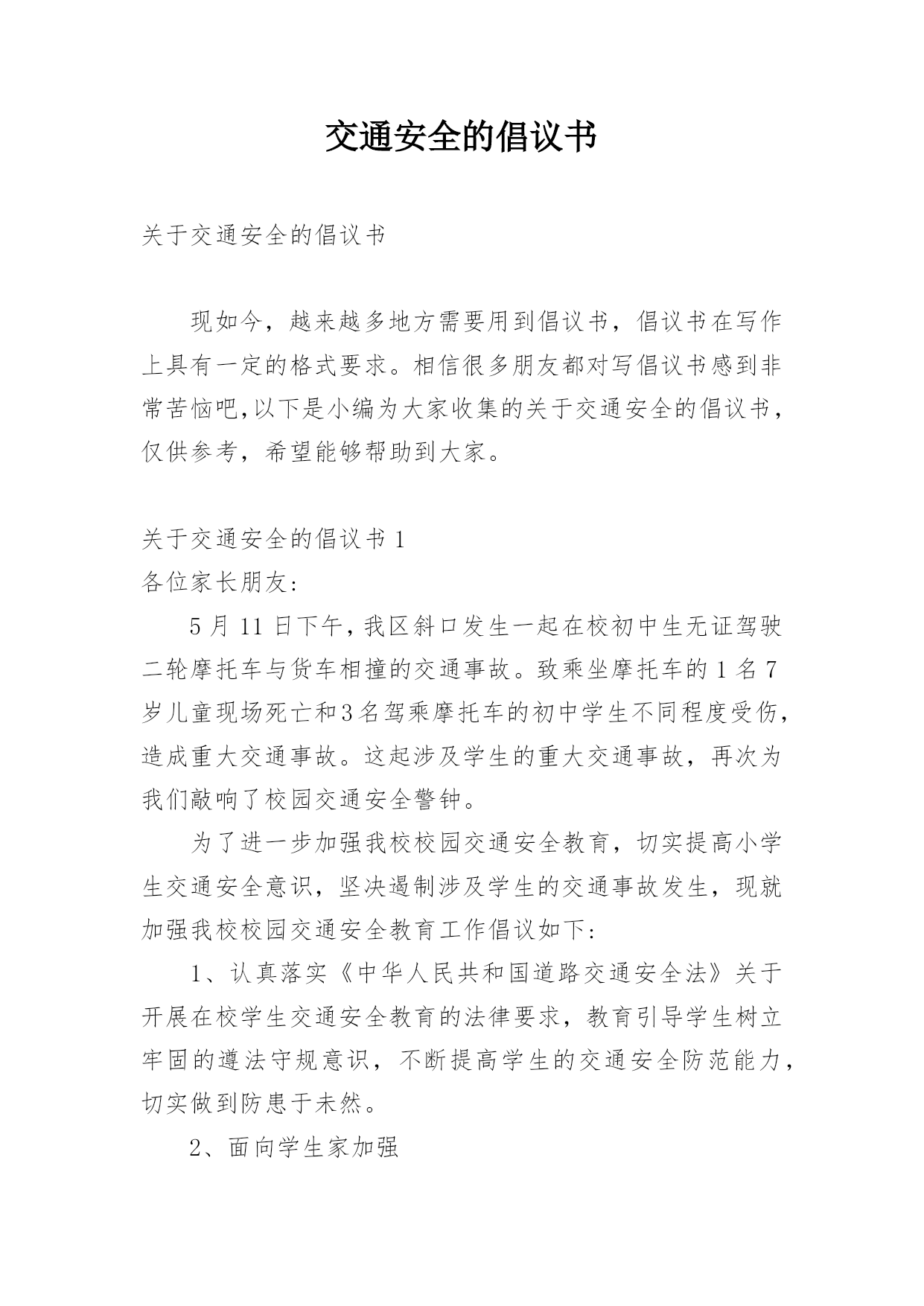 交通安全的倡议书关于交通安全的倡议书现如今,越来越多地方需要用到倡议书,倡议书在写作上具有一定的格式要求。相信很多朋友都对写倡议书感到非常苦恼吧,以下是小编为大家收集的关于交通安全的倡议书,仅供参考,希望能够帮助到大家。关于交通安全的倡议书1各位家长朋友:5月11日下午,我区斜口发生一起在校初中生无证驾驶二轮摩托车与货车相撞的交通事故。致乘坐摩托车的1名7岁儿童现场死亡和3名驾乘摩托车的初中学生不同程度受伤,造成重大交通事故。这起涉及学生的重大交通事故,再次为我们敲响了校园交通安全警钟。为了进一步加强我校