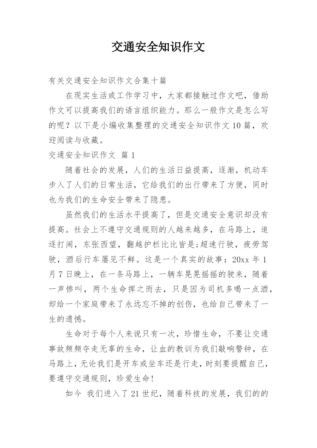 交通安全知识作文有关交通安全知识作文合集十篇在现实生活或工作学习中,大家都接触过作文吧,借助作文可以提高我们的语言组织能力。那么一般作文是怎么写的呢?以下是小编收集整理的交通安全知识作文10篇,欢迎阅读与收藏。交通安全知识作文篇1随着社会的发展,人们的生活日益提高,逐渐,机动车步入了人们的日常生活,它给我们的出行带来了方便,同时也为我们的生命安全带来了隐患。虽然我们的生活水平提高了,但是交通安全意识却没有提高。社会上不遵守交通规则的人越来越多,在马路上,追逐打闹,东张西望,翻越护栏比比皆是;超速行驶,疲劳
