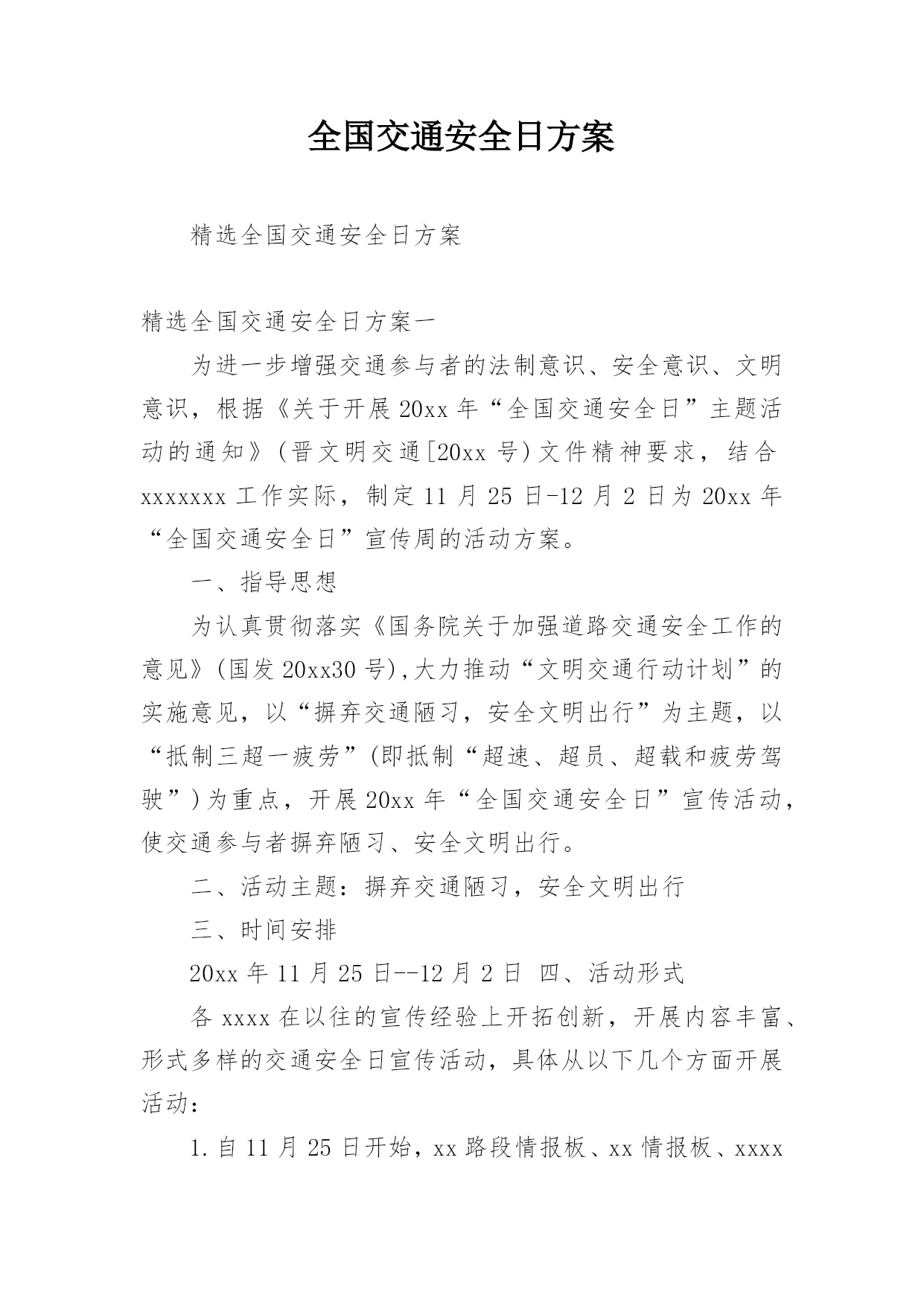 全国交通安全日方案精选全国交通安全日方案精选全国交通安全日方案一为进一步增强交通参与者的法制意识、安全意识、文明意识,根据《关于开展20xx年“全国交通安全日”主题活动的通知》(晋文明交通[20xx号)文件精神要求,结合xxxxxxx工作实际,制定11月25日-12月2日为20xx年“全国交通安全日”宣传周的活动方案。一、指导思想为认真贯彻落实《国务院关于加强道路交通安全工作的意见》(国发20xx30号),大力推动“文明交通行动计划”的实施意见,以“摒弃交通陋习,安全文明出行”为主题,以“抵制三超一疲劳”