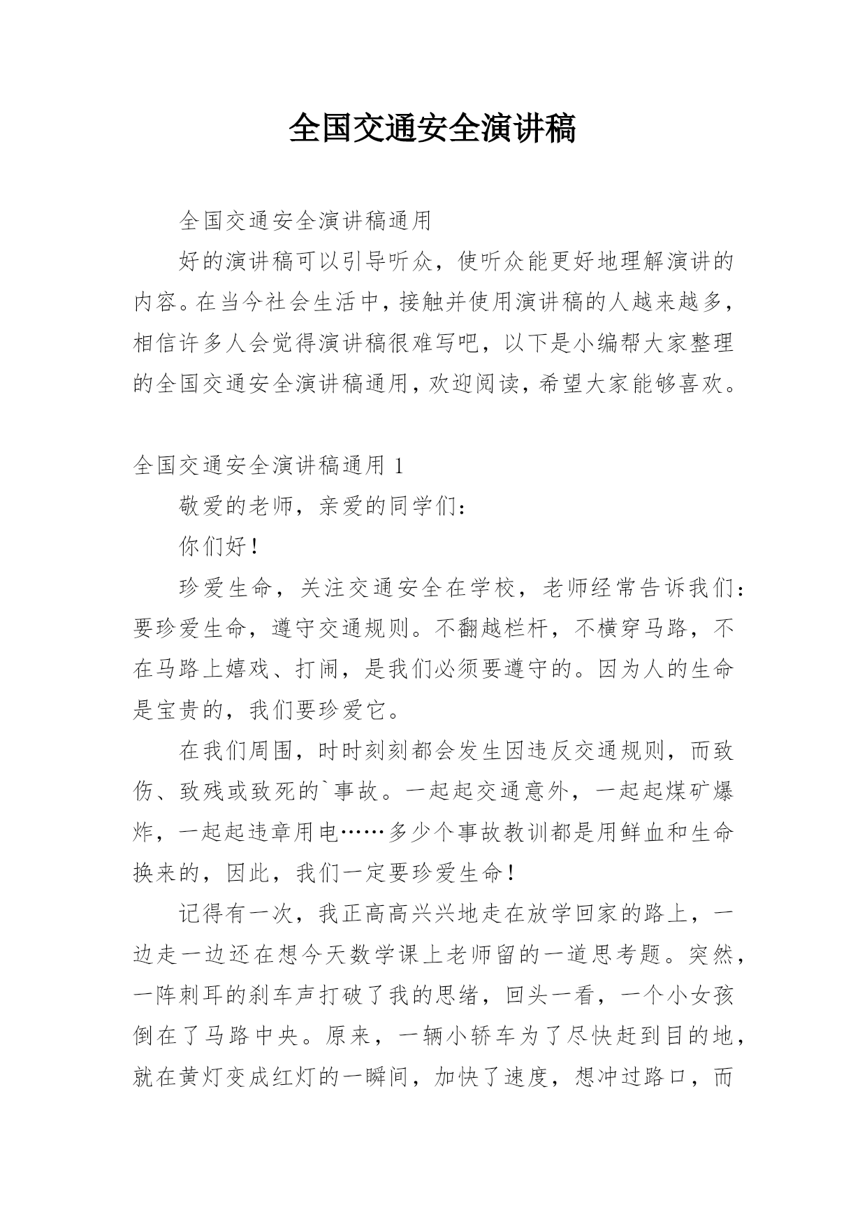 全国交通安全演讲稿全国交通安全演讲稿通用好的演讲稿可以引导听众,使听众能更好地理解演讲的内容。在当今社会生活中,接触并使用演讲稿的人越来越多,相信许多人会觉得演讲稿很难写吧,以下是小编帮大家整理的全国交通安全演讲稿通用,欢迎阅读,希望大家能够喜欢。全国交通安全演讲稿通用1敬爱的老师,亲爱的同学们:你们好!珍爱生命,关注交通安全在学校,老师经常告诉我们:要珍爱生命,遵守交通规则。不翻越栏杆,不横穿马路,不在马路上嬉戏、打闹,是我们必须要遵守的。因为人的生命是宝贵的,我们要珍爱它。在我们周围,时时刻刻都会发生