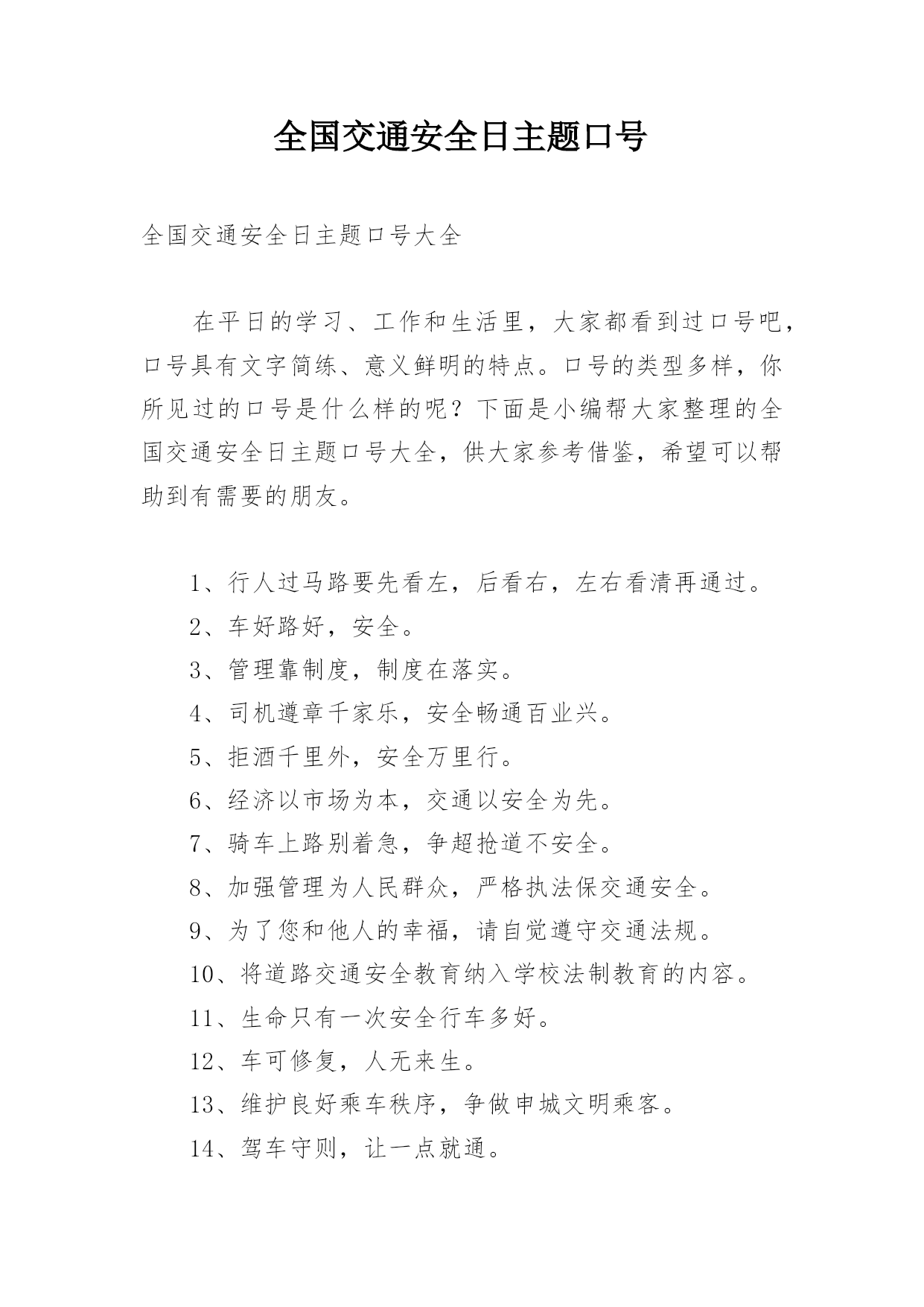 全国交通安全日主题口号全国交通安全日主题口号大全在平日的学习、工作和生活里,大家都看到过口号吧,口号具有文字简练、意义鲜明的特点。口号的类型多样,你所见过的口号是什么样的呢?下面是小编帮大家整理的全国交通安全日主题口号大全,供大家参考借鉴,希望可以帮助到有需要的朋友。1、行人过马路要先看左,后看右,左右看清再通过。2、车好路好,安全。3、管理靠制度,制度在落实。4、司机遵章千家乐,安全畅通百业兴。5、拒酒千里外,安全万里行。6、经济以市场为本,交通以安全为先。7、骑车上路别着急,争超抢道不安全。8、加强管