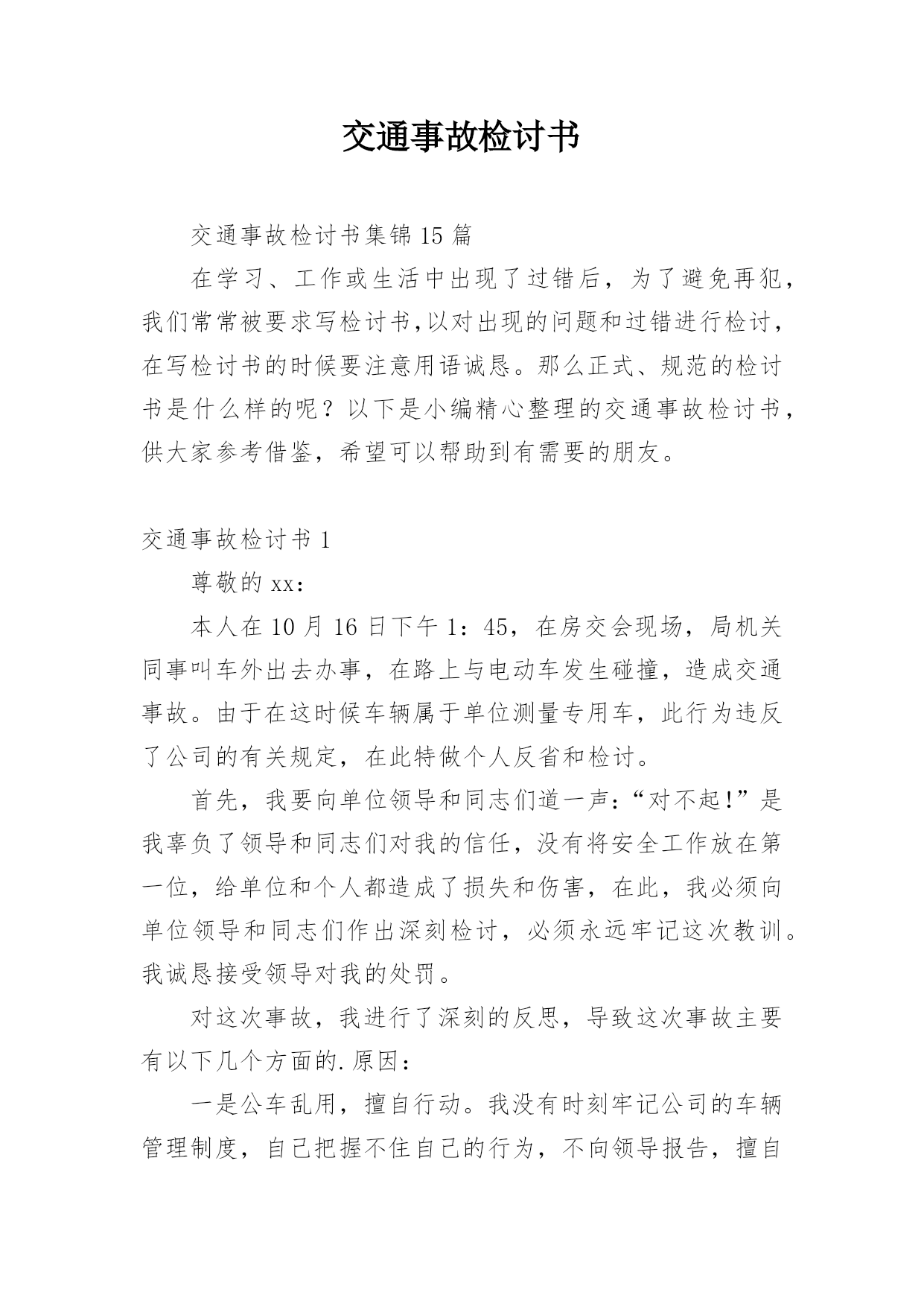 交通事故检讨书交通事故检讨书集锦15篇在学习、工作或生活中出现了过错后,为了避免再犯,我们常常被要求写检讨书,以对出现的问题和过错进行检讨,在写检讨书的时候要注意用语诚恳。那么正式、规范的检讨书是什么样的呢?以下是小编精心整理的交通事故检讨书,供大家参考借鉴,希望可以帮助到有需要的朋友。交通事故检讨书1尊敬的xx:本人在10月16日下午1:45,在房交会现场,局机关同事叫车外出去办事,在路上与电动车发生碰撞,造成交通事故。由于在这时候车辆属于单位测量专用车,此行为违反了公司的有关规定,在此特做个人反省和检