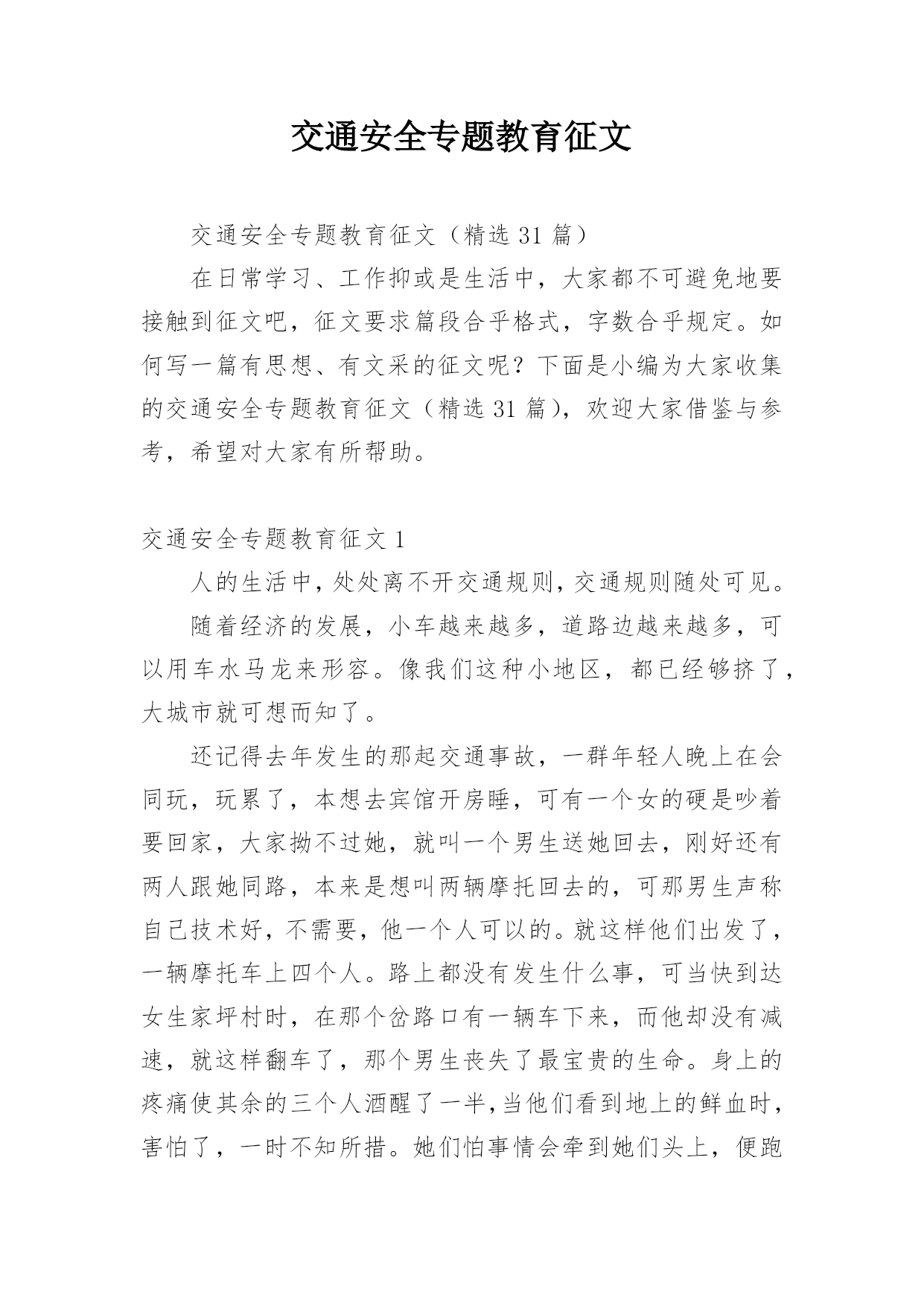 交通安全专题教育征文交通安全专题教育征文(精选31篇)在日常学习、工作抑或是生活中,大家都不可避免地要接触到征文吧,征文要求篇段合乎格式,字数合乎规定。如何写一篇有思想、有文采的征文呢?下面是小编为大家收集的交通安全专题教育征文(精选31篇),欢迎大家借鉴与参考,希望对大家有所帮助。交通安全专题教育征文1人的生活中,处处离不开交通规则,交通规则随处可见。随着经济的发展,小车越来越多,道路边越来越多,可以用车水马龙来形容。像我们这种小地区,都已经够挤了,大城市就可想而知了。还记得去年发生的那起交通事故,一群