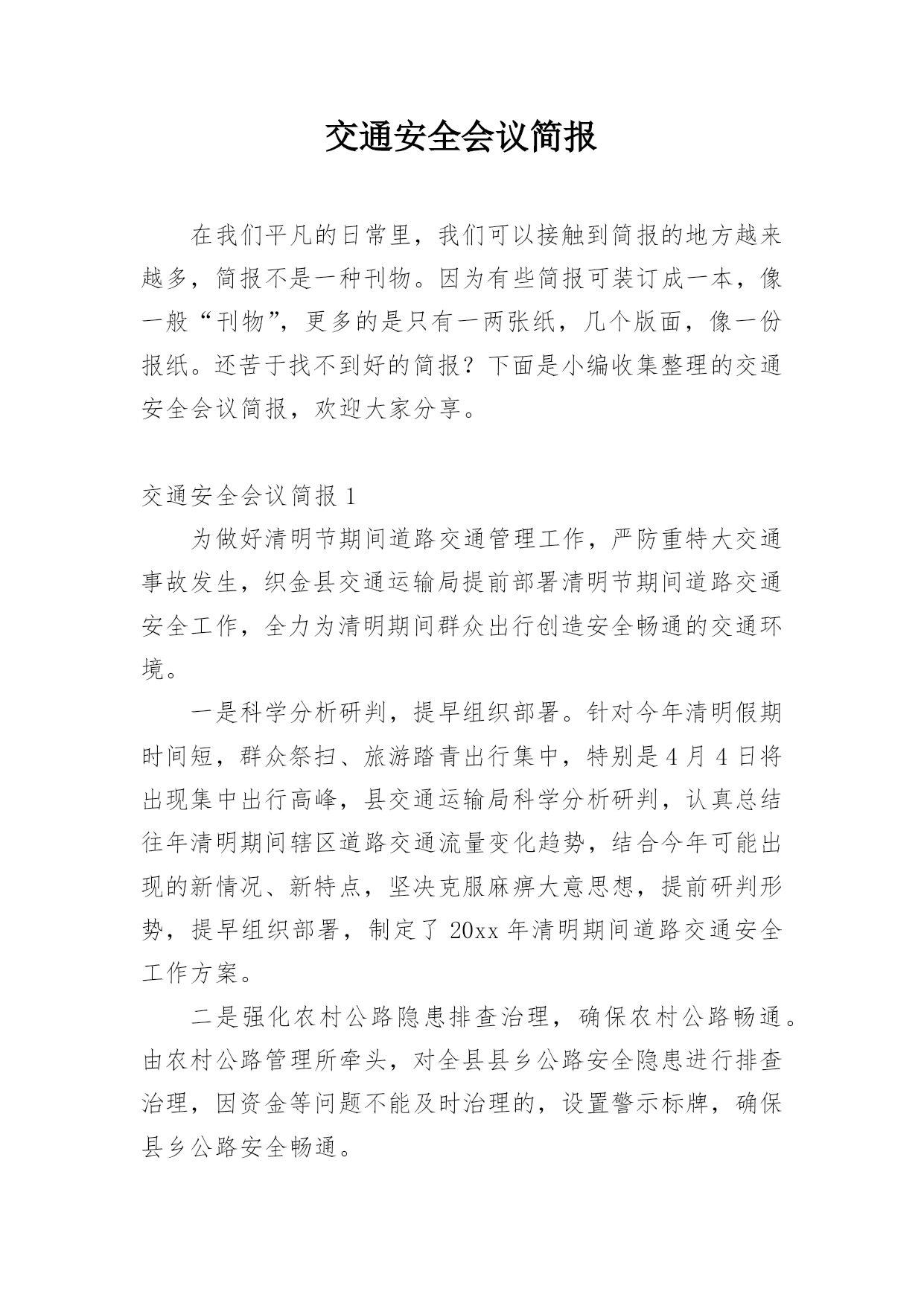 交通安全会议简报在我们平凡的日常里,我们可以接触到简报的地方越来越多,简报不是一种刊物。因为有些简报可装订成一本,像一般“刊物”,更多的是只有一两张纸,几个版面,像一份报纸。还苦于找不到好的简报?下面是小编收集整理的交通安全会议简报,欢迎大家分享。交通安全会议简报1为做好清明节期间道路交通管理工作,严防重特大交通事故发生,织金县交通运输局提前部署清明节期间道路交通安全工作,全力为清明期间群众出行创造安全畅通的交通环境。一是科学分析研判,提早组织部署。针对今年清明假期时间短,群众祭扫、旅游踏青出行集中,特别