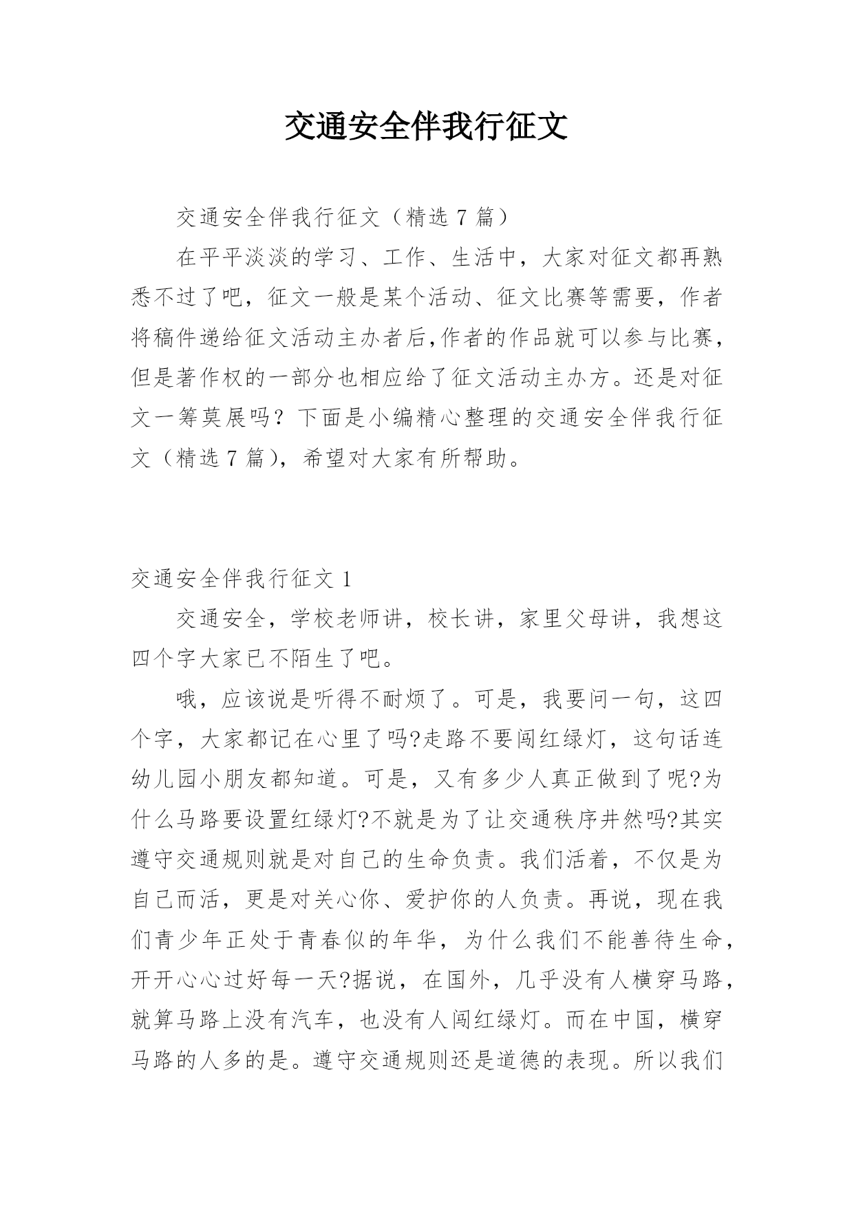 交通安全伴我行征文交通安全伴我行征文(精选7篇)在平平淡淡的学习、工作、生活中,大家对征文都再熟悉不过了吧,征文一般是某个活动、征文比赛等需要,作者将稿件递给征文活动主办者后,作者的作品就可以参与比赛,但是著作权的一部分也相应给了征文活动主办方。还是对征文一筹莫展吗?下面是小编精心整理的交通安全伴我行征文(精选7篇),希望对大家有所帮助。交通安全伴我行征文1交通安全,学校老师讲,校长讲,家里父母讲,我想这四个字大家已不陌生了吧。哦,应该说是听得不耐烦了。可是,我要问一句,这四个字,大家都记在心里了吗?走路