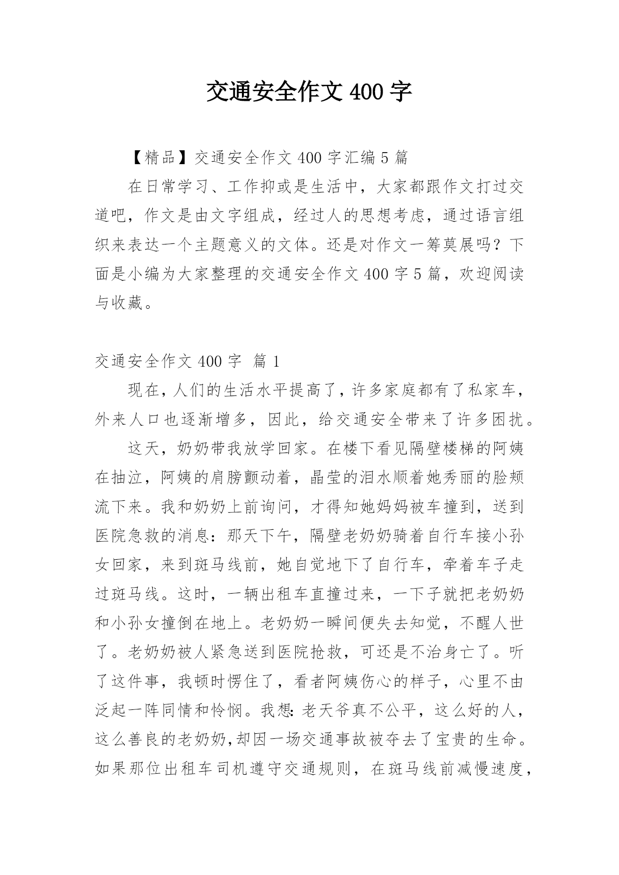 交通安全作文400字【精品】交通安全作文400字汇编5篇在日常学习、工作抑或是生活中,大家都跟作文打过交道吧,作文是由文字组成,经过人的思想考虑,通过语言组织来表达一个主题意义的文体。还是对作文一筹莫展吗?下面是小编为大家整理的交通安全作文400字5篇,欢迎阅读与收藏。交通安全作文400字篇1现在,人们的生活水平提高了,许多家庭都有了私家车,外来人口也逐渐增多,因此,给交通安全带来了许多困扰。这天,奶奶带我放学回家。在楼下看见隔壁楼梯的阿姨在抽泣,阿姨的肩膀颤动着,晶莹的泪水顺着她秀丽的脸颊流下来。我和奶