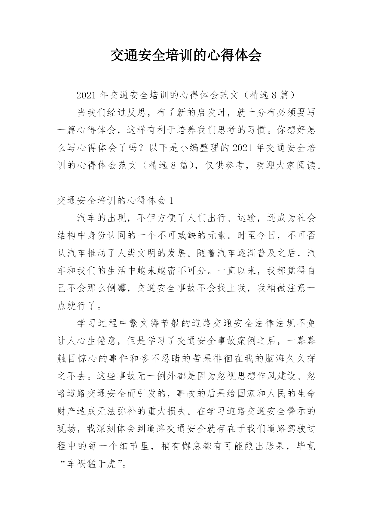 交通安全培训的心得体会2021年交通安全培训的心得体会范文(精选8篇)当我们经过反思,有了新的启发时,就十分有必须要写一篇心得体会,这样有利于培养我们思考的习惯。你想好怎么写心得体会了吗?以下是小编整理的2021年交通安全培训的心得体会范文(精选8篇),仅供参考,欢迎大家阅读。交通安全培训的心得体会1汽车的出现,不但方便了人们出行、运输,还成为社会结构中身份认同的一个不可或缺的元素。时至今日,不可否认汽车推动了人类文明的发展。随着汽车逐渐普及之后,汽车和我们的生活中越来越密不可分。一直以来,我都觉得自己不