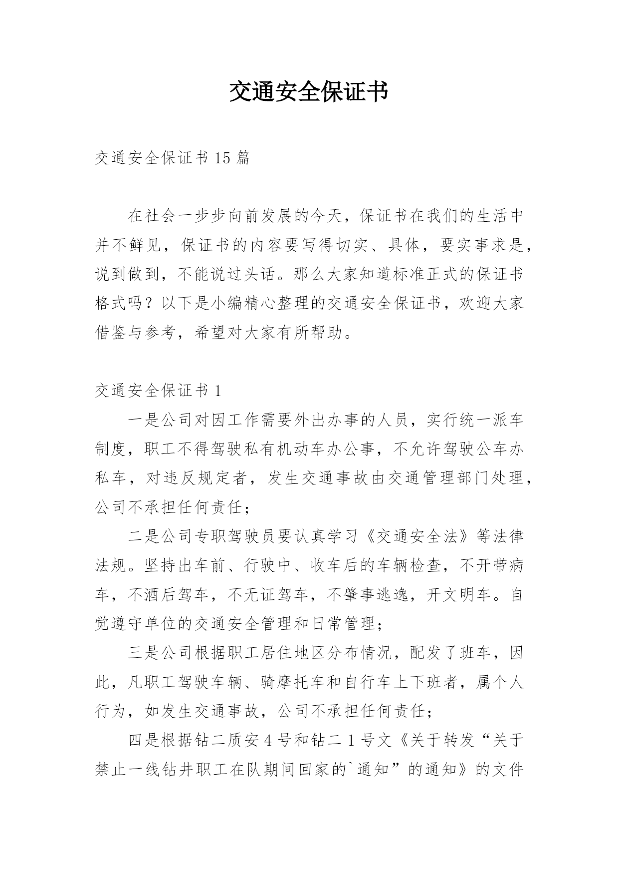 交通安全保证书交通安全保证书15篇在社会一步步向前发展的今天,保证书在我们的生活中并不鲜见,保证书的内容要写得切实、具体,要实事求是,说到做到,不能说过头话。那么大家知道标准正式的保证书格式吗?以下是小编精心整理的交通安全保证书,欢迎大家借鉴与参考,希望对大家有所帮助。交通安全保证书1一是公司对因工作需要外出办事的人员,实行统一派车制度,职工不得驾驶私有机动车办公事,不允许驾驶公车办私车,对违反规定者,发生交通事故由交通管理部门处理,公司不承担任何责任;二是公司专职驾驶员要认真学习《交通安全法》等法律法规
