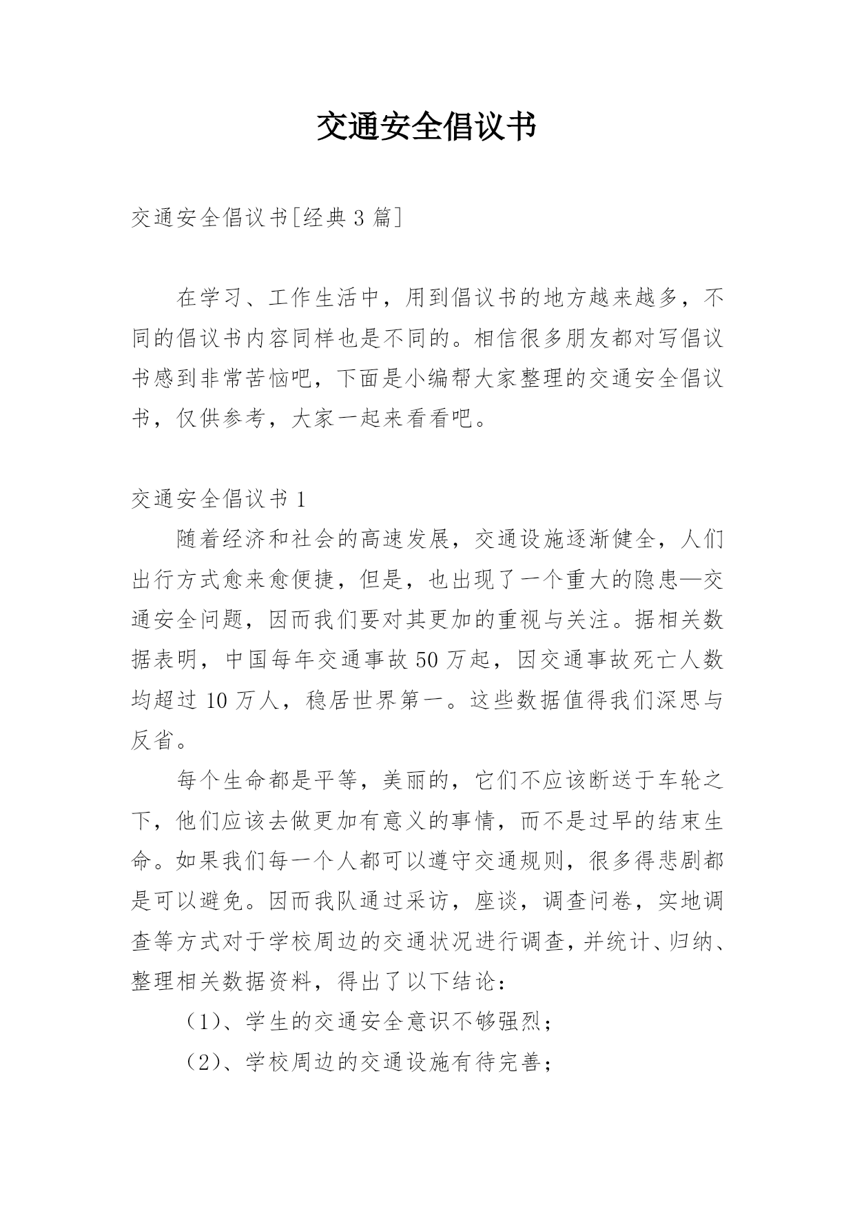 交通安全倡议书交通安全倡议书[经典3篇]在学习、工作生活中,用到倡议书的地方越来越多,不同的倡议书内容同样也是不同的。相信很多朋友都对写倡议书感到非常苦恼吧,下面是小编帮大家整理的交通安全倡议书,仅供参考,大家一起来看看吧。交通安全倡议书1随着经济和社会的高速发展,交通设施逐渐健全,人们出行方式愈来愈便捷,但是,也出现了一个重大的隐患—交通安全问题,因而我们要对其更加的重视与关注。据相关数据表明,中国每年交通事故50万起,因交通事故死亡人数均超过10万人,稳居世界第一。这些数据值得我们深思与反省。每个生命