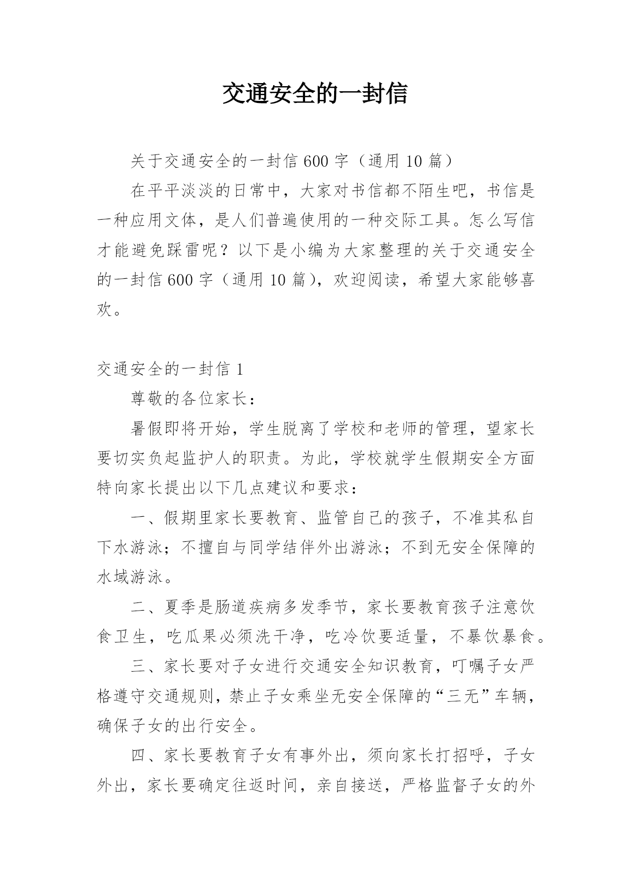 交通安全的一封信关于交通安全的一封信600字(通用10篇)在平平淡淡的日常中,大家对书信都不陌生吧,书信是一种应用文体,是人们普遍使用的一种交际工具。怎么写信才能避免踩雷呢?以下是小编为大家整理的关于交通安全的一封信600字(通用10篇),欢迎阅读,希望大家能够喜欢。交通安全的一封信1尊敬的各位家长:暑假即将开始,学生脱离了学校和老师的管理,望家长要切实负起监护人的职责。为此,学校就学生假期安全方面特向家长提出以下几点建议和要求:一、假期里家长要教育、监管自己的孩子,不准其私自下水游泳;不擅自与同学结伴外