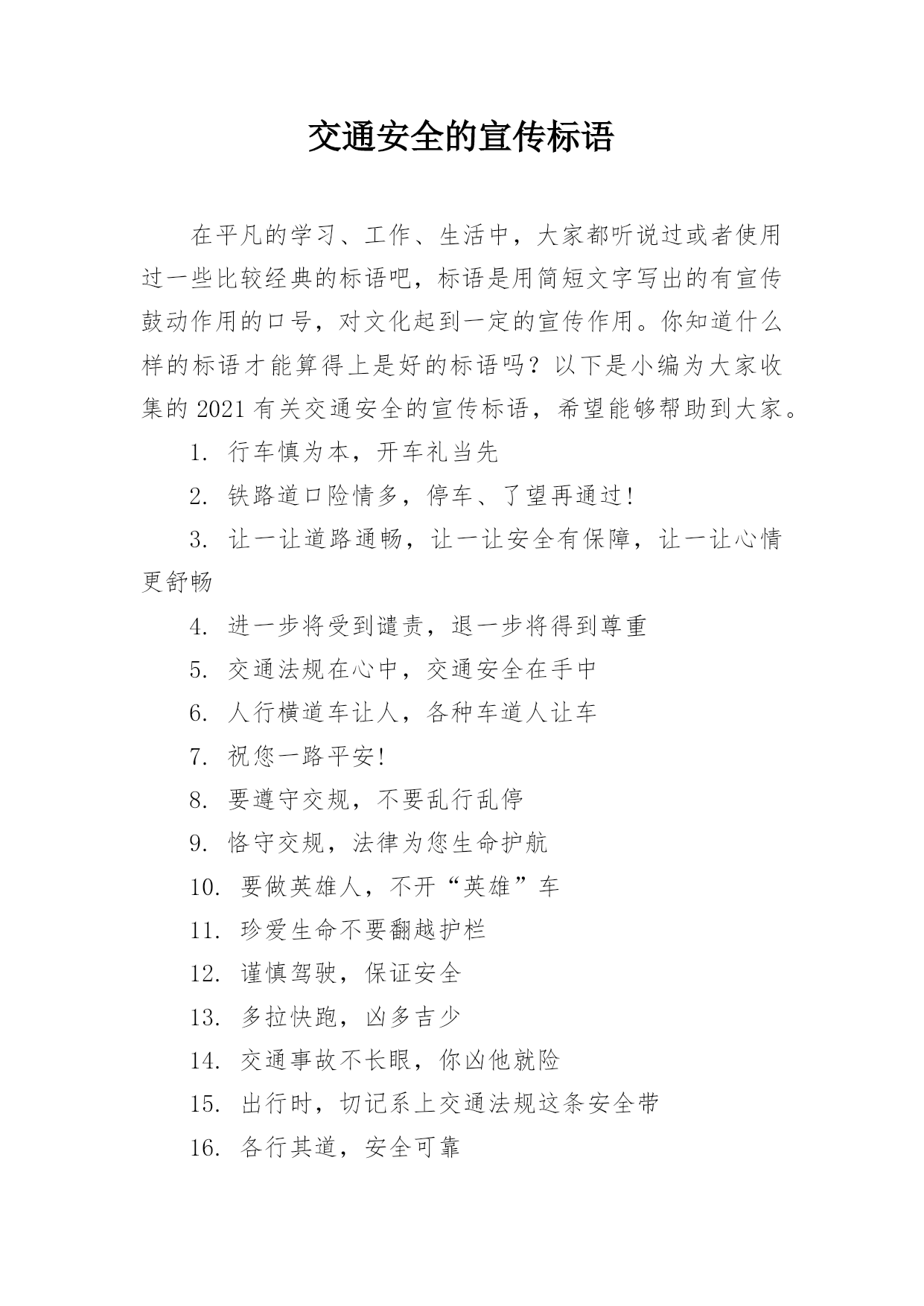 交通安全的宣传标语在平凡的学习、工作、生活中,大家都听说过或者使用过一些比较经典的标语吧,标语是用简短文字写出的有宣传鼓动作用的口号,对文化起到一定的宣传作用。你知道什么样的标语才能算得上是好的标语吗?以下是小编为大家收集的2021有关交通安全的宣传标语,希望能够帮助到大家。1.行车慎为本,开车礼当先2.铁路道口险情多,停车、了望再通过!3.让一让道路通畅,让一让安全有保障,让一让心情更舒畅4.进一步将受到谴责,退一步将得到尊重5.交通法规在心中,交通安全在手中6.人行横道车让人,各种车道人让车7.祝您一