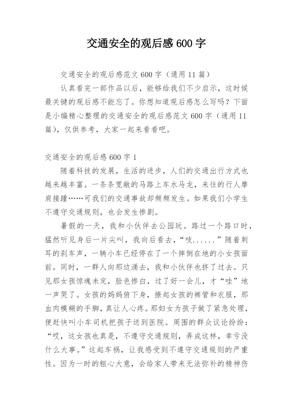 交通安全的观后感600字交通安全的观后感范文600字(通用11篇)认真看完一部作品以后,能够给我们不少启示,这时候最关键的观后感不能忘了。你想知道观后感怎么写吗?下面是小编精心整理的交通安全的观后感范文600字(通用11篇),仅供参考,大家一起来看看吧。交通安全的观后感600字1随着科技的发展,生活的进步,人们的交通出行方式也越来越丰富。一条条宽敞的马路上车水马龙,来往的行人摩肩接踵……可我们的交通事故却频频发生。如果我们小学生不遵守交通规则,也会发生惨剧。暑假的一天,我和小伙伴去公园玩。路过一个路口时,
