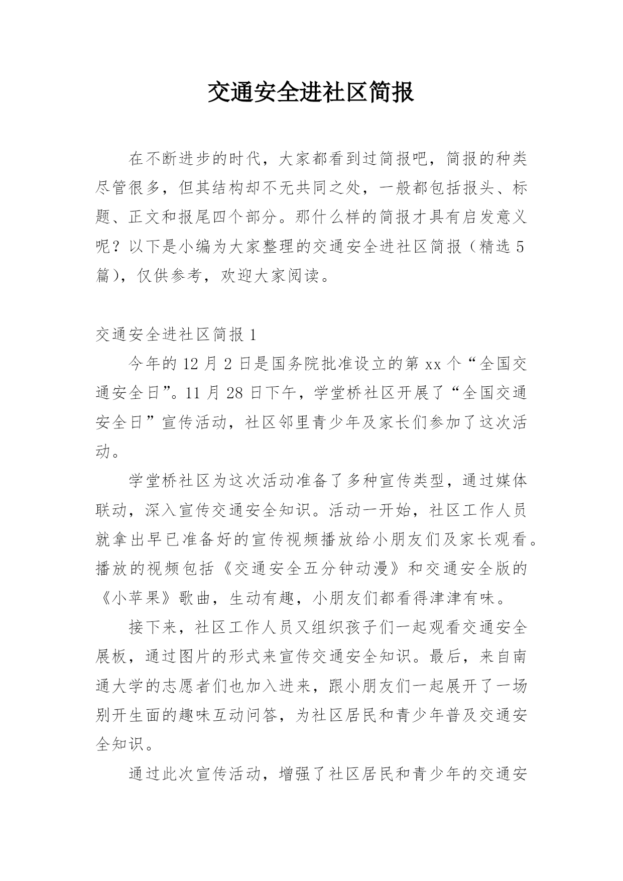 交通安全进社区简报在不断进步的时代,大家都看到过简报吧,简报的种类尽管很多,但其结构却不无共同之处,一般都包括报头、标题、正文和报尾四个部分。那什么样的简报才具有启发意义呢?以下是小编为大家整理的交通安全进社区简报(精选5篇),仅供参考,欢迎大家阅读。交通安全进社区简报1今年的12月2日是国务院批准设立的第xx个“全国交通安全日”。11月28日下午,学堂桥社区开展了“全国交通安全日”宣传活动,社区邻里青少年及家长们参加了这次活动。学堂桥社区为这次活动准备了多种宣传类型,通过媒体联动,深入宣传交通安全知识。