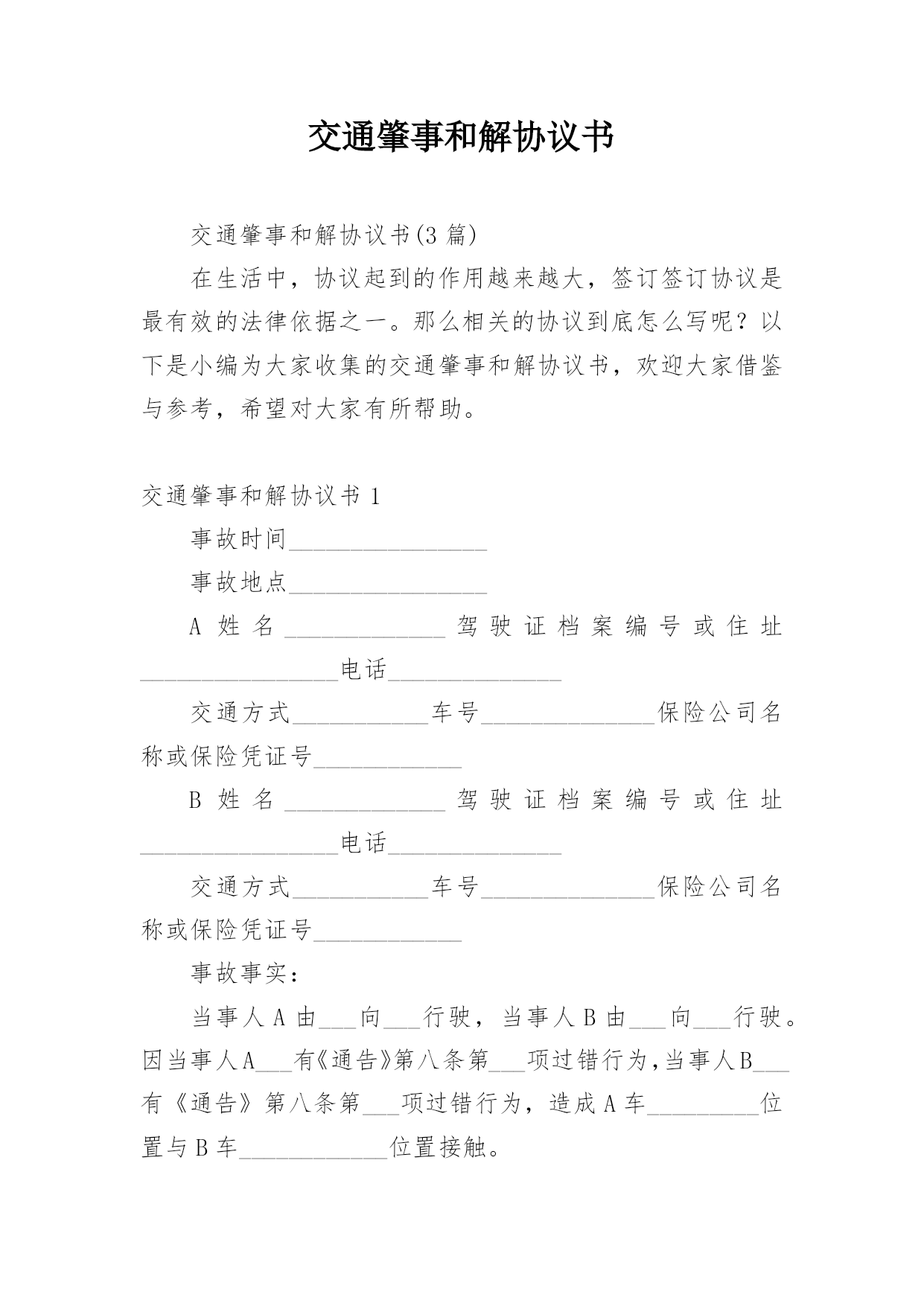 交通肇事和解协议书交通肇事和解协议书(3篇)在生活中,协议起到的作用越来越大,签订签订协议是最有效的法律依据之一。那么相关的协议到底怎么写呢?以下是小编为大家收集的交通肇事和解协议书,欢迎大家借鉴与参考,希望对大家有所帮助。交通肇事和解协议书1事故时间________________事故地点________________A姓名_____________驾驶证档案编号或住址________________电话______________交通方式___________车号______________保险公司