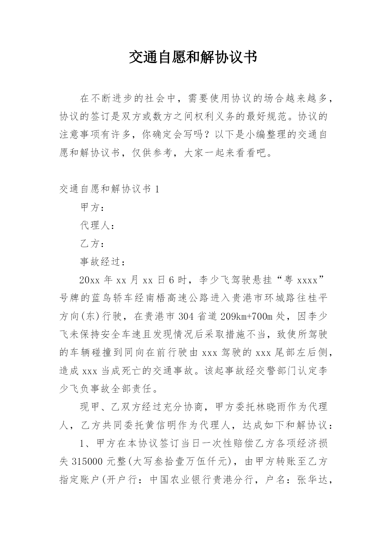 交通自愿和解协议书在不断进步的社会中,需要使用协议的场合越来越多,协议的签订是双方或数方之间权利义务的最好规范。协议的注意事项有许多,你确定会写吗?以下是小编整理的交通自愿和解协议书,仅供参考,大家一起来看看吧。交通自愿和解协议书1甲方:代理人:乙方:事故经过:20xx年xx月xx日6时,李少飞驾驶悬挂“粤xxxx”号牌的蓝鸟轿车经南梧高速公路进入贵港市环城路往桂平方向(东)行驶,在贵港市304省道209km+700m处,因李少飞未保持安全车速且发现情况后采取措施不当,致使所驾驶的车辆碰撞到同向在前行驶由