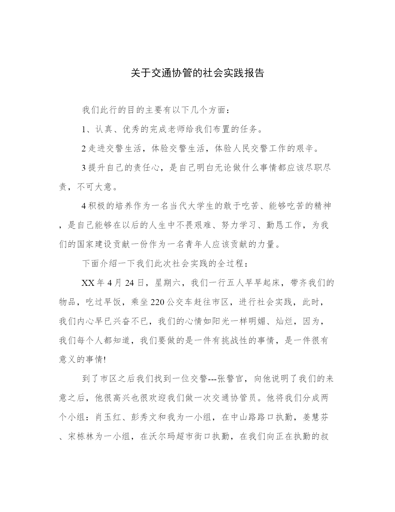 关于交通协管的社会实践报告我们此行的目的主要有以下几个方面:1、认真、优秀的完成老师给我们布置的任务。2走进交警生活,体验交警生活,体验人民交警工作的艰辛。3提升自己的责任心,是自己明白无论做什么事情都应该尽职尽责,不可大意。4积极的培养作为一名当代大学生的敢于吃苦、能够吃苦的精神,是自己能够在以后的人生中不畏艰难、努力学习、勤恳工作,为我们的国家建设贡献一份作为一名青年人应该贡献的力量。下面介绍一下我们此次社会实践的全过程:XX年4月24日,星期六,我们一行五人早早起床,带齐我们的物品,吃过早饭,乘坐2