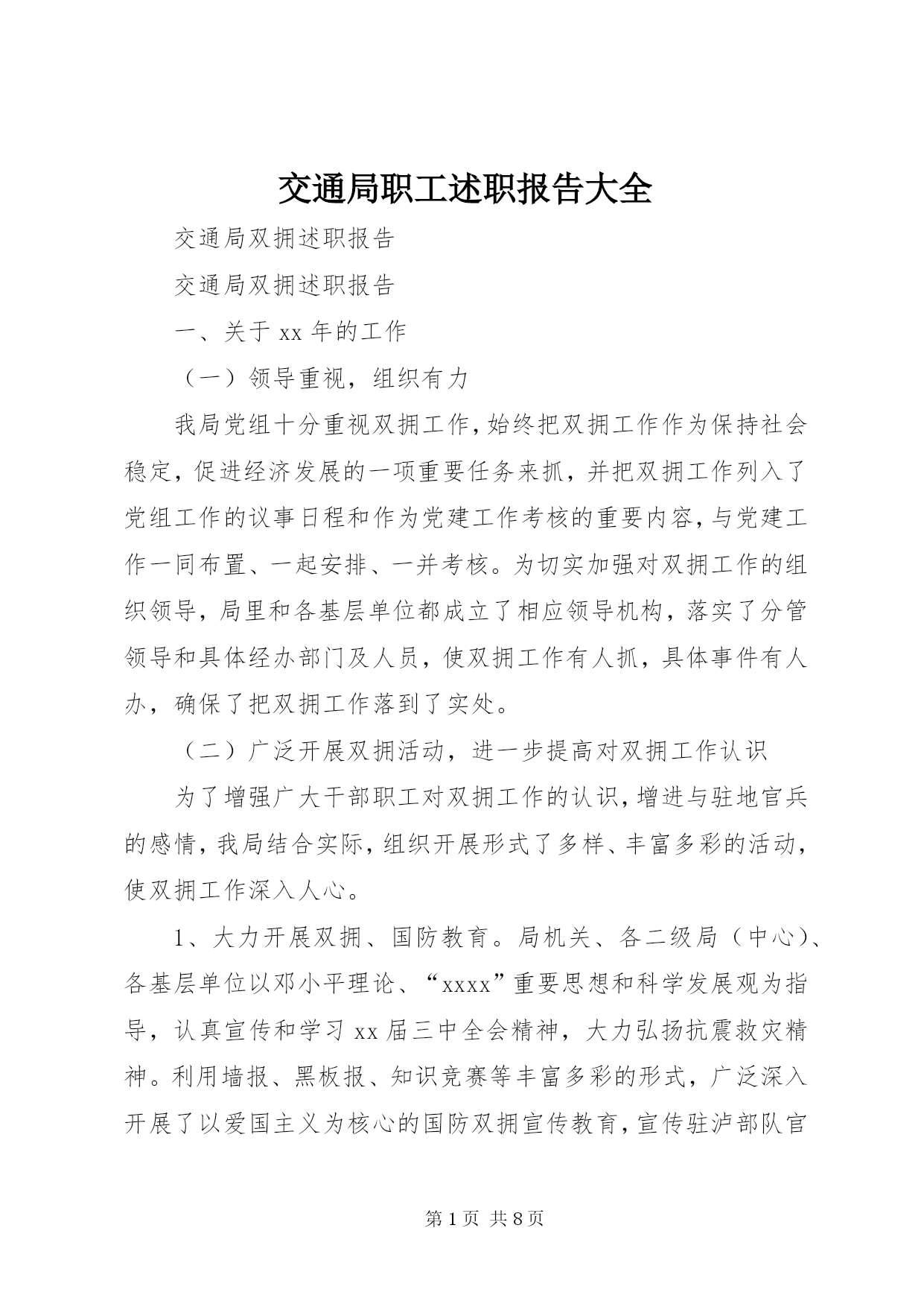 第PAGE\*Arabic\*MERGEFORMAT8页共NUMPAGES\*MERGEFORMAT8页交通局职工述职报告大全交通局双拥述职报告交通局双拥述职报告一、关于xx年的工作(一)领导重视,组织有力我局党组十分重视双拥工作,始终把双拥工作作为保持社会稳定,促进经济发展的一项重要任务来抓,并把双拥工作列入了党组工作的议事日程和作为党建工作考核的重要内容,与党建工作一同布置、一起安排、一并考核。为切实加强对双拥工作的组织领导,局里和各基层单位都成立了相应领导机构,落实了分管领导和具体经办部