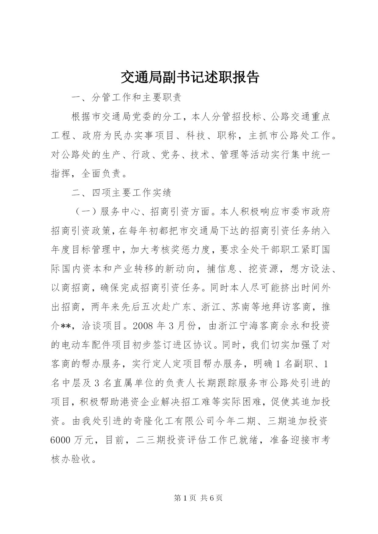 第PAGE\*Arabic\*MERGEFORMAT6页共NUMPAGES\*MERGEFORMAT6页交通局副书记述职报告一、分管工作和主要职责根据市交通局党委的分工,本人分管招投标、公路交通重点工程、政府为民办实事项目、科技、职称,主抓市公路处工作。对公路处的生产、行政、党务、技术、管理等活动实行集中统一指挥,全面负责。二、四项主要工作实绩(一)服务中心、招商引资方面。本人积极响应市委市政府招商引资政策,在每年初都把市交通局下达的招商引资任务纳入年度目标管理中,加大考核奖惩力度,要求全处干