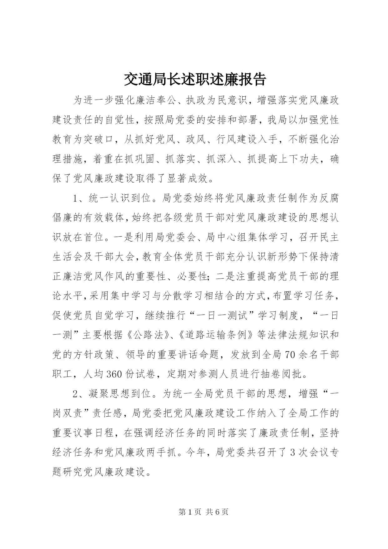 第PAGE\*Arabic\*MERGEFORMAT6页共NUMPAGES\*MERGEFORMAT6页交通局长述职述廉报告为进一步强化廉洁奉公、执政为民意识,增强落实党风廉政建设责任的自觉性,按照局党委的安排和部署,我局以加强党性教育为突破口,从抓好党风、政风、行风建设入手,不断强化治理措施,着重在抓巩固、抓落实、抓深入、抓提高上下功夫,确保了党风廉政建设取得了显著成效。1、统一认识到位。局党委始终将党风廉政责任制作为反腐倡廉的有效载体,始终把各级党员干部对党风廉政建设的思想认识放在首位。一