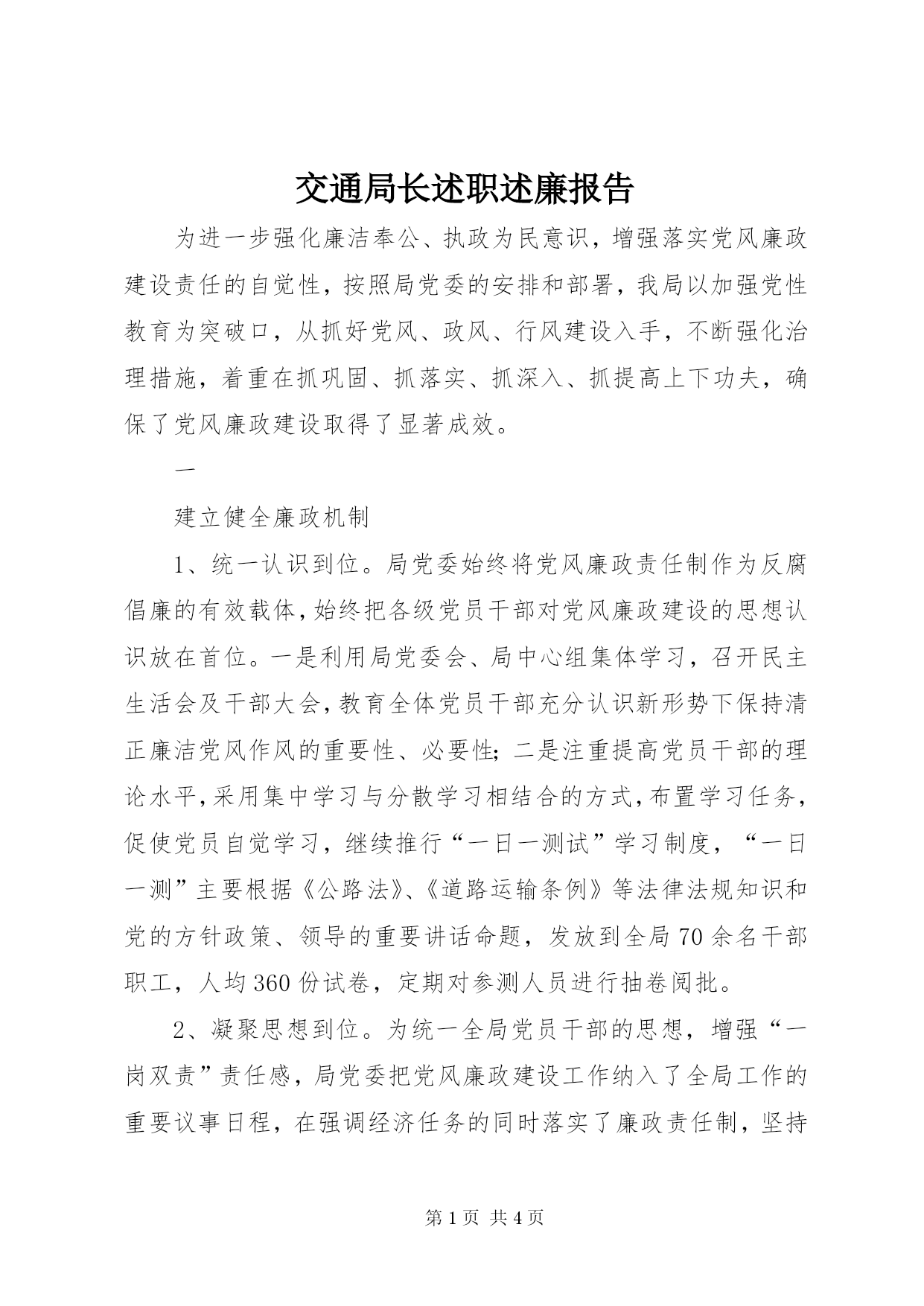 第PAGE\*Arabic\*MERGEFORMAT4页共NUMPAGES\*MERGEFORMAT4页交通局长述职述廉报告为进一步强化廉洁奉公、执政为民意识,增强落实党风廉政建设责任的自觉性,按照局党委的安排和部署,我局以加强党性教育为突破口,从抓好党风、政风、行风建设入手,不断强化治理措施,着重在抓巩固、抓落实、抓深入、抓提高上下功夫,确保了党风廉政建设取得了显著成效。一建立健全廉政机制1、统一认识到位。局党委始终将党风廉政责任制作为反腐倡廉的有效载体,始终把各级党员干部对党风廉政建设的思