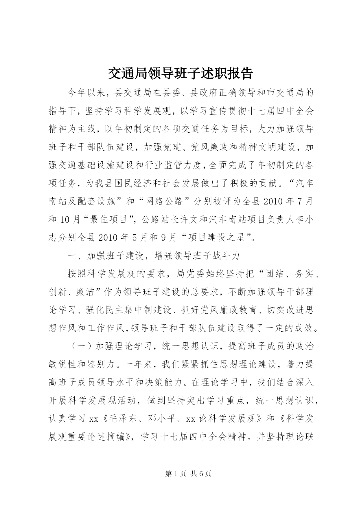 第PAGE\*Arabic\*MERGEFORMAT6页共NUMPAGES\*MERGEFORMAT6页交通局领导班子述职报告今年以来,县交通局在县委、县政府正确领导和市交通局的指导下,坚持学习科学发展观,以学习宣传贯彻十七届四中全会精神为主线,以年初制定的各项交通任务为目标,大力加强领导班子和干部队伍建设,加强党建、党风廉政和精神文明建设,加强交通基础设施建设和行业监管力度,全面完成了年初制定的各项任务,为我县国民经济和社会发展做出了积极的贡献。“汽车南站及配套设施”和“网络公路”分别被评为