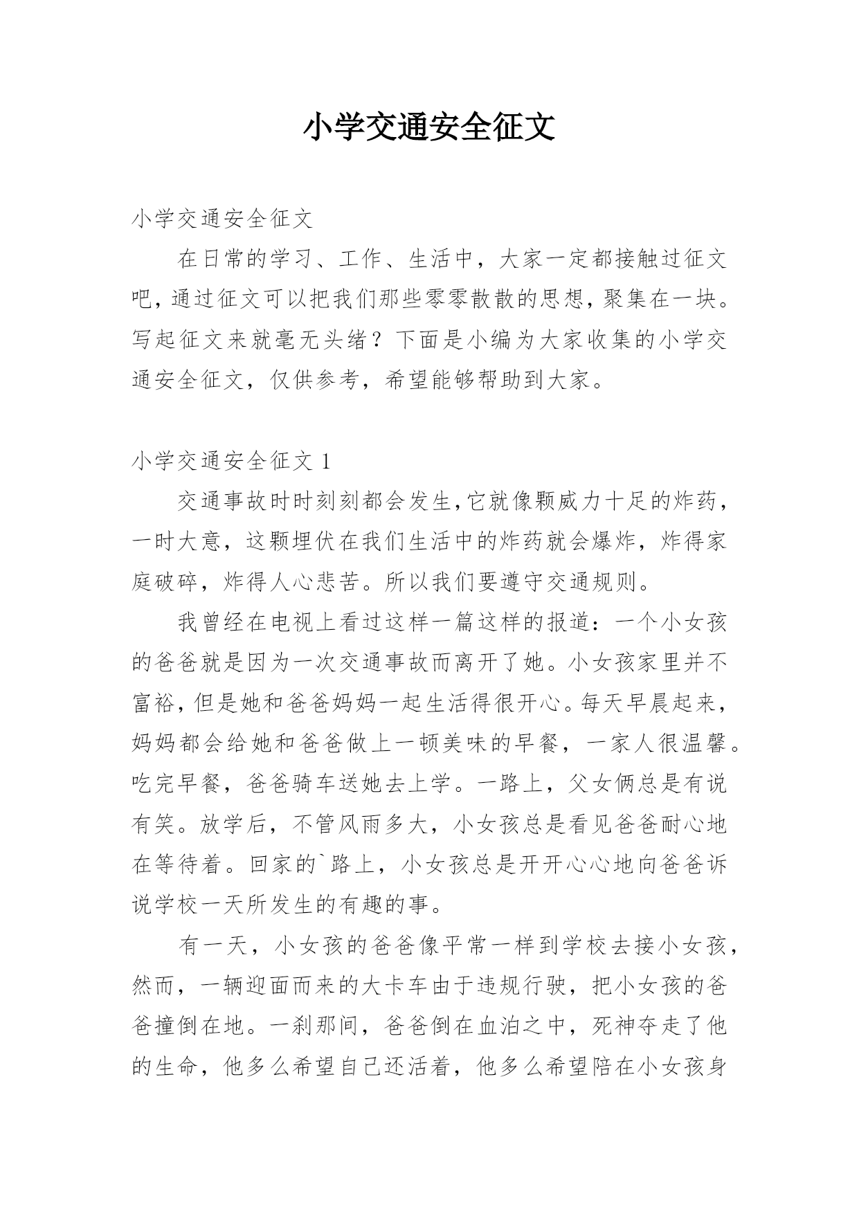 小学交通安全征文小学交通安全征文在日常的学习、工作、生活中,大家一定都接触过征文吧,通过征文可以把我们那些零零散散的思想,聚集在一块。写起征文来就毫无头绪?下面是小编为大家收集的小学交通安全征文,仅供参考,希望能够帮助到大家。小学交通安全征文1交通事故时时刻刻都会发生,它就像颗威力十足的炸药,一时大意,这颗埋伏在我们生活中的炸药就会爆炸,炸得家庭破碎,炸得人心悲苦。所以我们要遵守交通规则。我曾经在电视上看过这样一篇这样的报道:一个小女孩的爸爸就是因为一次交通事故而离开了她。小女孩家里并不富裕,但是她和爸爸