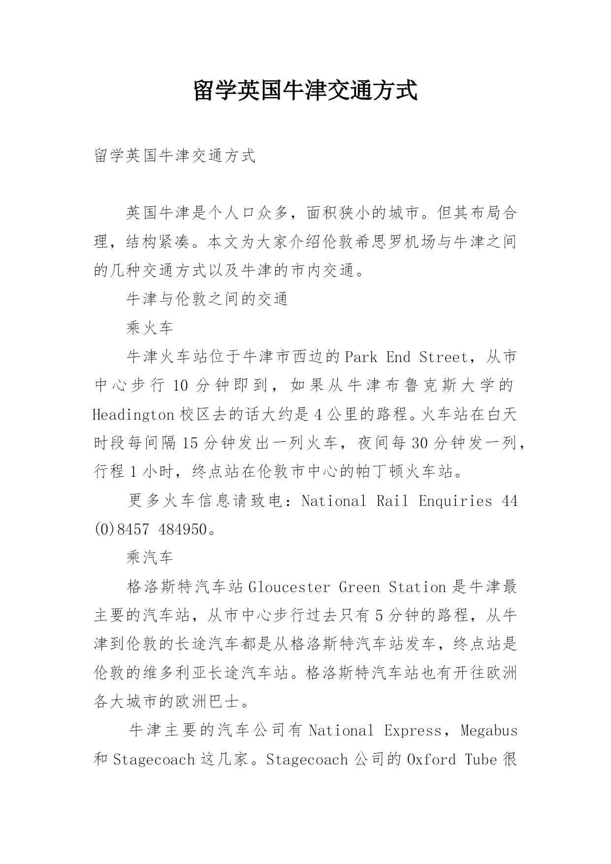 留学英国牛津交通方式留学英国牛津交通方式英国牛津是个人口众多,面积狭小的城市。但其布局合理,结构紧凑。本文为大家介绍伦敦希思罗机场与牛津之间的几种交通方式以及牛津的市内交通。牛津与伦敦之间的交通乘火车牛津火车站位于牛津市西边的ParkEndStreet,从市中心步行10分钟即到,如果从牛津布鲁克斯大学的Headington校区去的话大约是4公里的路程。火车站在白天时段每间隔15分钟发出一列火车,夜间每30分钟发一列,行程1小时,终点站在伦敦市中心的帕丁顿火车站。更多火车信息请致电:NationalRail