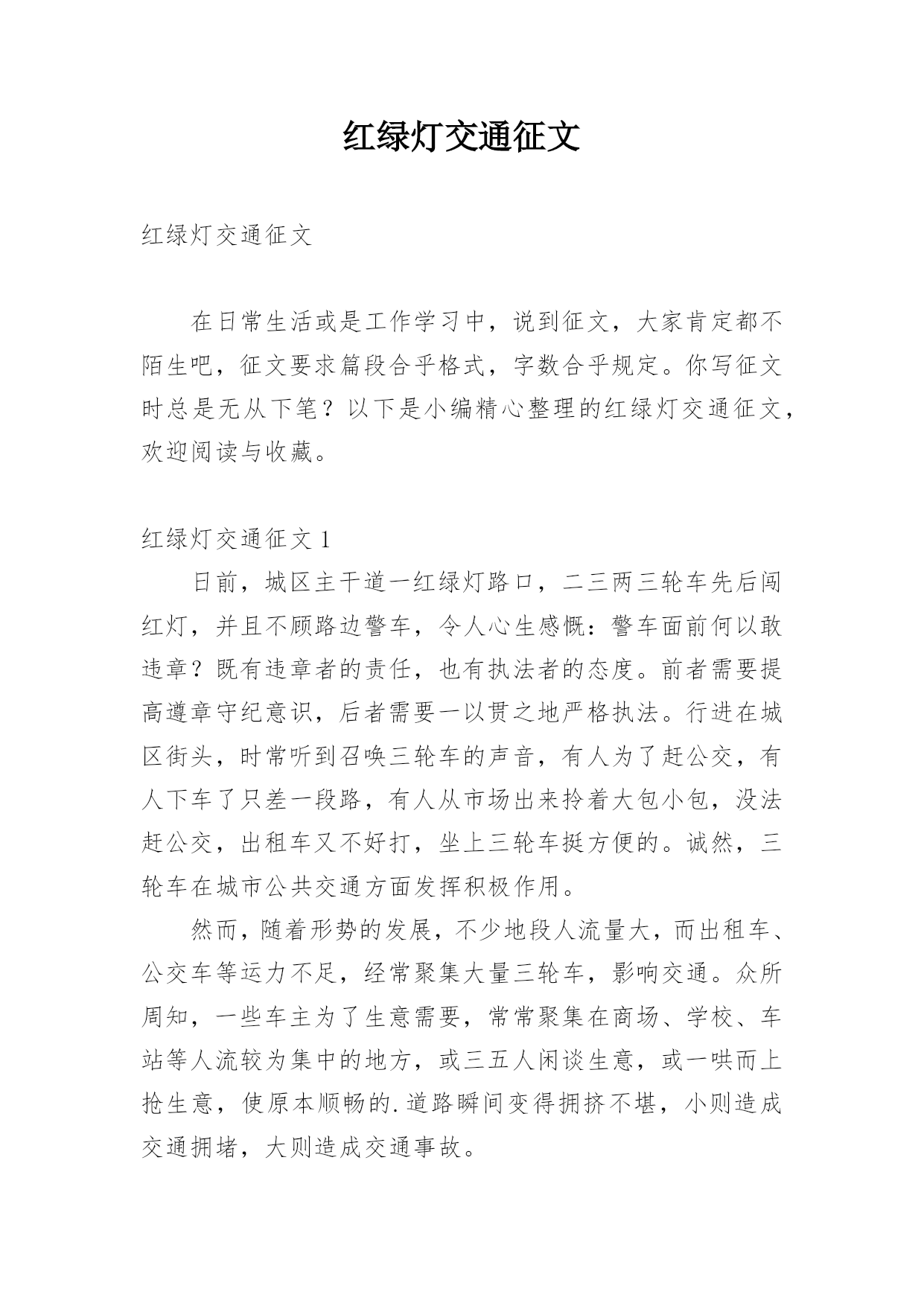 红绿灯交通征文红绿灯交通征文在日常生活或是工作学习中,说到征文,大家肯定都不陌生吧,征文要求篇段合乎格式,字数合乎规定。你写征文时总是无从下笔?以下是小编精心整理的红绿灯交通征文,欢迎阅读与收藏。红绿灯交通征文1日前,城区主干道一红绿灯路口,二三两三轮车先后闯红灯,并且不顾路边警车,令人心生感慨:警车面前何以敢违章?既有违章者的责任,也有执法者的态度。前者需要提高遵章守纪意识,后者需要一以贯之地严格执法。行进在城区街头,时常听到召唤三轮车的声音,有人为了赶公交,有人下车了只差一段路,有人从市场出来拎着大包