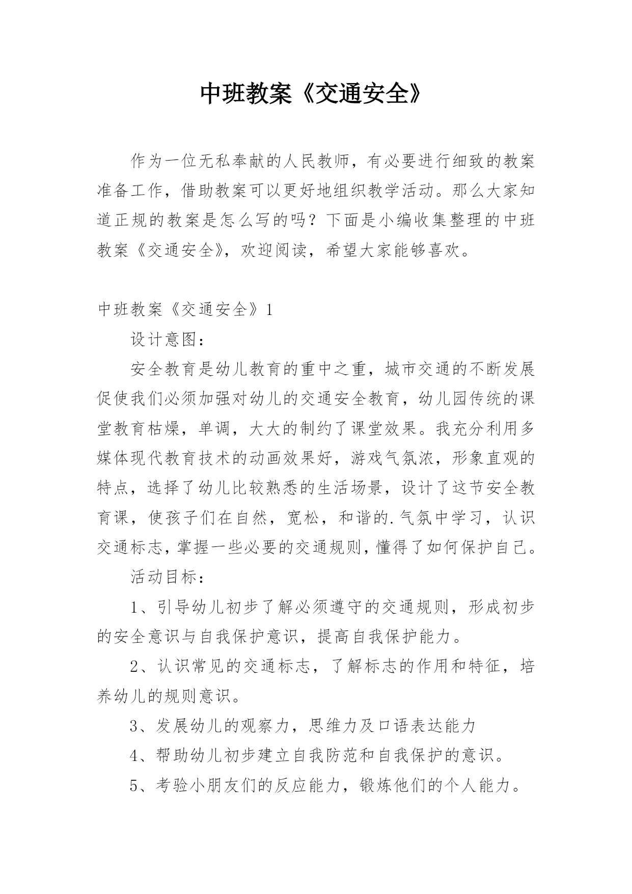 中班教案《交通安全》作为一位无私奉献的人民教师,有必要进行细致的教案准备工作,借助教案可以更好地组织教学活动。那么大家知道正规的教案是怎么写的吗?下面是小编收集整理的中班教案《交通安全》,欢迎阅读,希望大家能够喜欢。中班教案《交通安全》1设计意图:安全教育是幼儿教育的重中之重,城市交通的不断发展促使我们必须加强对幼儿的交通安全教育,幼儿园传统的课堂教育枯燥,单调,大大的制约了课堂效果。我充分利用多媒体现代教育技术的动画效果好,游戏气氛浓,形象直观的特点,选择了幼儿比较熟悉的生活场景,设计了这节安全教育课,