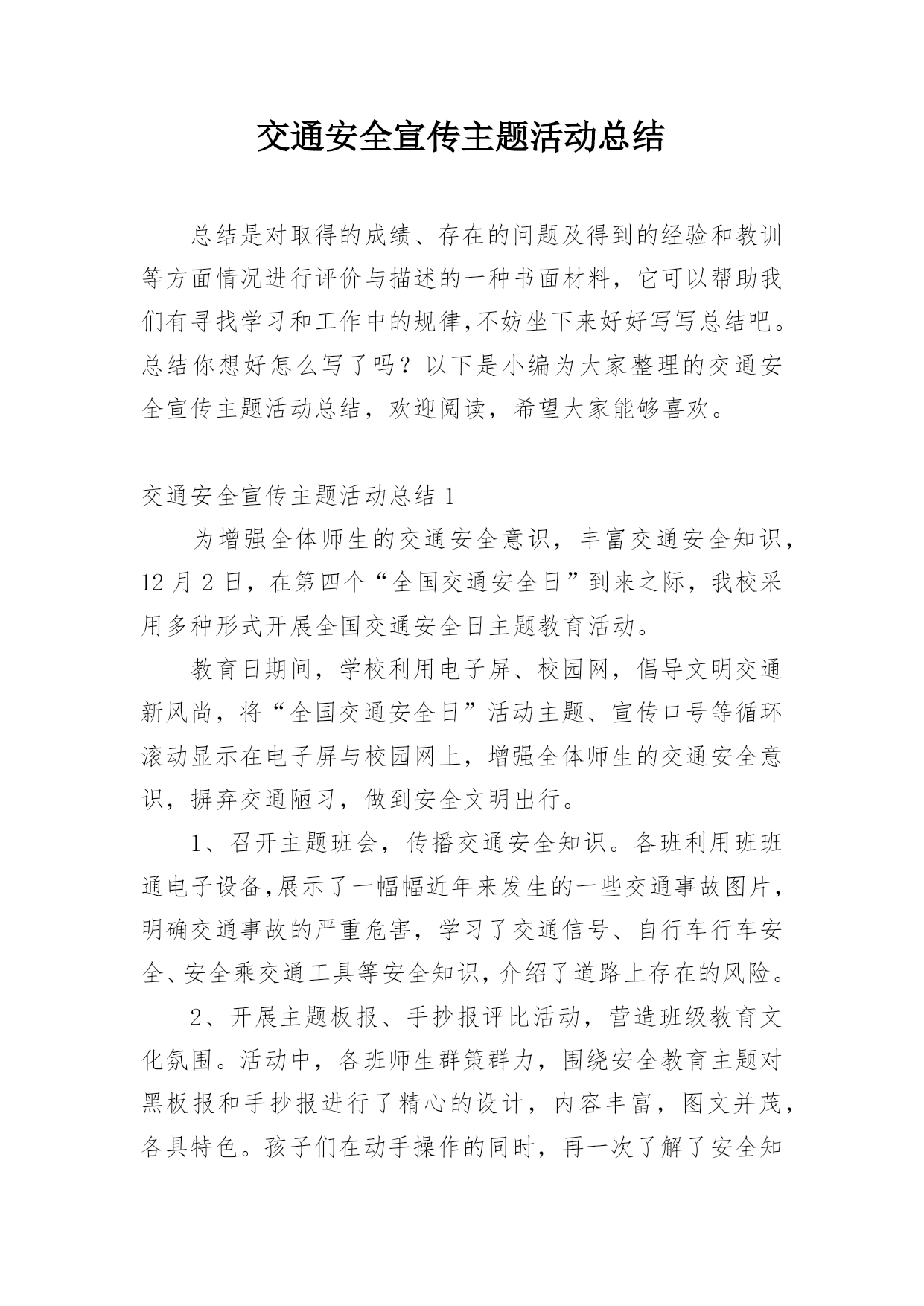 交通安全宣传主题活动总结总结是对取得的成绩、存在的问题及得到的经验和教训等方面情况进行评价与描述的一种书面材料,它可以帮助我们有寻找学习和工作中的规律,不妨坐下来好好写写总结吧。总结你想好怎么写了吗?以下是小编为大家整理的交通安全宣传主题活动总结,欢迎阅读,希望大家能够喜欢。交通安全宣传主题活动总结1为增强全体师生的交通安全意识,丰富交通安全知识,12月2日,在第四个“全国交通安全日”到来之际,我校采用多种形式开展全国交通安全日主题教育活动。教育日期间,学校利用电子屏、校园网,倡导文明交通新风尚,将“全国