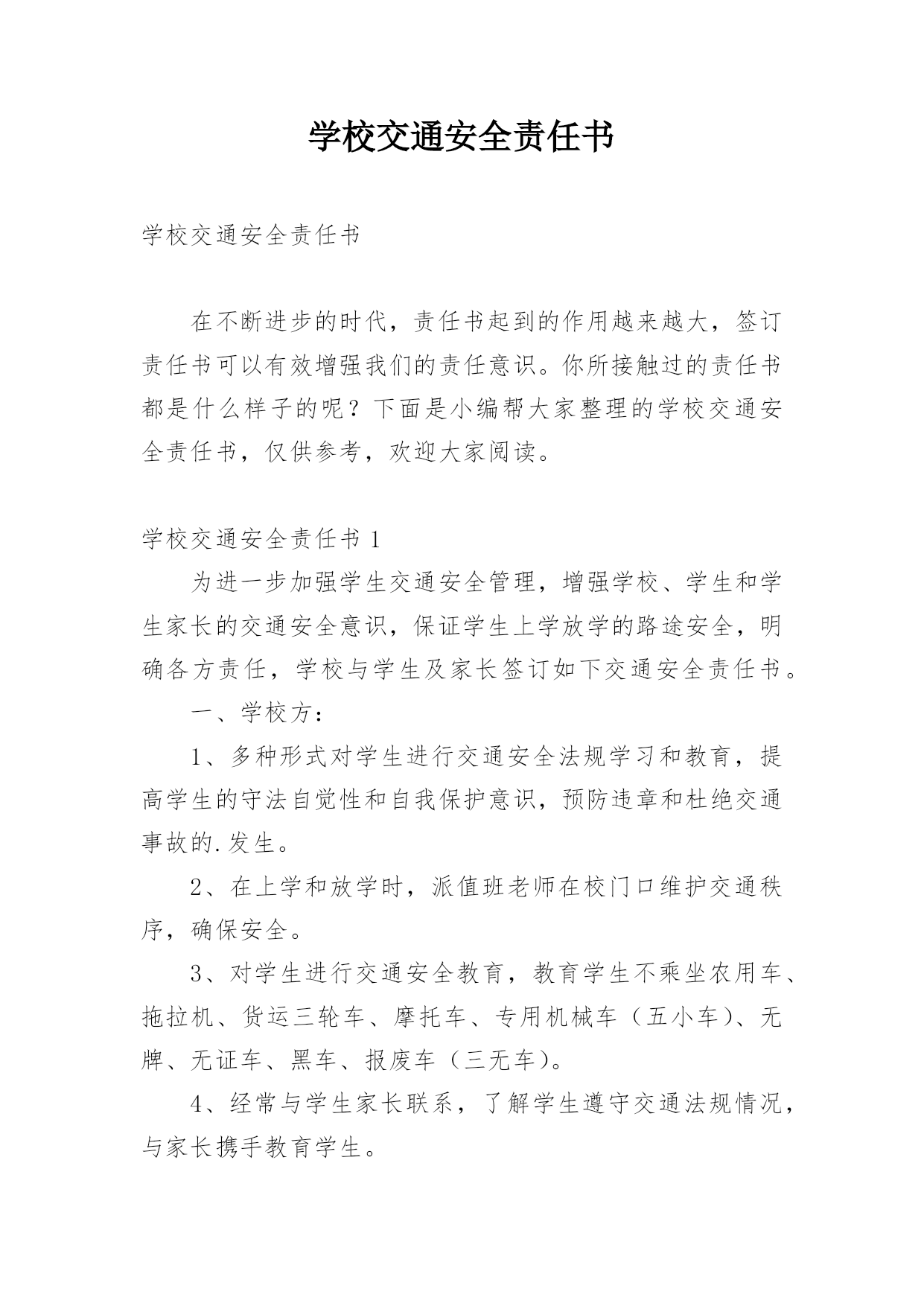 学校交通安全责任书学校交通安全责任书在不断进步的时代,责任书起到的作用越来越大,签订责任书可以有效增强我们的责任意识。你所接触过的责任书都是什么样子的呢?下面是小编帮大家整理的学校交通安全责任书,仅供参考,欢迎大家阅读。学校交通安全责任书1为进一步加强学生交通安全管理,增强学校、学生和学生家长的交通安全意识,保证学生上学放学的路途安全,明确各方责任,学校与学生及家长签订如下交通安全责任书。一、学校方:1、多种形式对学生进行交通安全法规学习和教育,提高学生的守法自觉性和自我保护意识,预防违章和杜绝交通事故的
