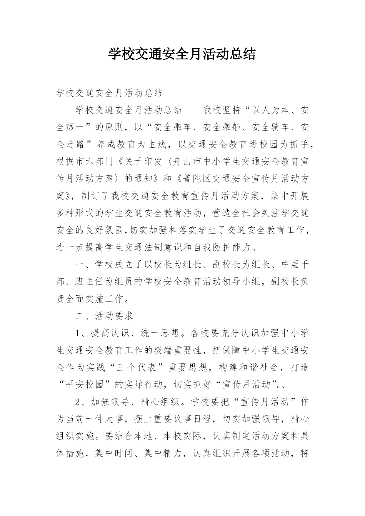 学校交通安全月活动总结学校交通安全月活动总结学校交通安全月活动总结我校坚持“以人为本、安全第一”的原则,以“安全乘车、安全乘船、安全骑车、安全走路”养成教育为主线,以交通安全教育进校园为抓手,根据市六部门《关于印发〈舟山市中小学生交通安全教育宣传月活动方案〉的通知》和《普陀区交通安全宣传月活动方案》,制订了我校交通安全教育宣传月活动方案,集中开展多种形式的学生交通安全教育活动,营造全社会关注学交通安全的良好氛围,切实加强和落实学生了交通安全教育工作,进一步提高学生交通法制意识和自我防护能力。一、学校成立了