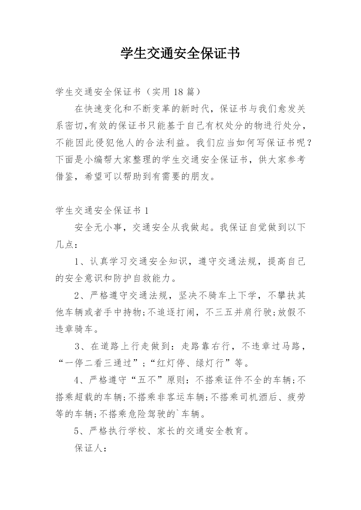 学生交通安全保证书学生交通安全保证书(实用18篇)在快速变化和不断变革的新时代,保证书与我们愈发关系密切,有效的保证书只能基于自己有权处分的物进行处分,不能因此侵犯他人的合法利益。我们应当如何写保证书呢?下面是小编帮大家整理的学生交通安全保证书,供大家参考借鉴,希望可以帮助到有需要的朋友。学生交通安全保证书1安全无小事,交通安全从我做起。我保证自觉做到以下几点:1、认真学习交通安全知识,遵守交通法规,提高自己的安全意识和防护自救能力。2、严格遵守交通法规,坚决不骑车上下学,不攀扶其他车辆或者手中持物;不追